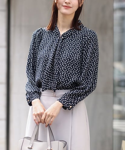 暗くなりがちな冬も、柄のボウタイブラウスを合わせて華やかさをプラス。