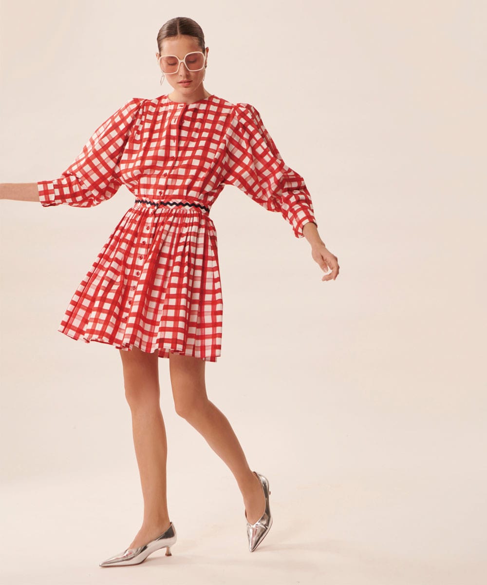 ポップなカラーと手書きのチェック柄がとってもキュート。コンパクトな首回り・ボリュームスリーブは顔を小さく見せてくれます。スカートに施されたネイビーのウェーブテープが全体の引き締め役に。足元をきれいめにするのが、大人の着こなしを叶えるポイントです。
