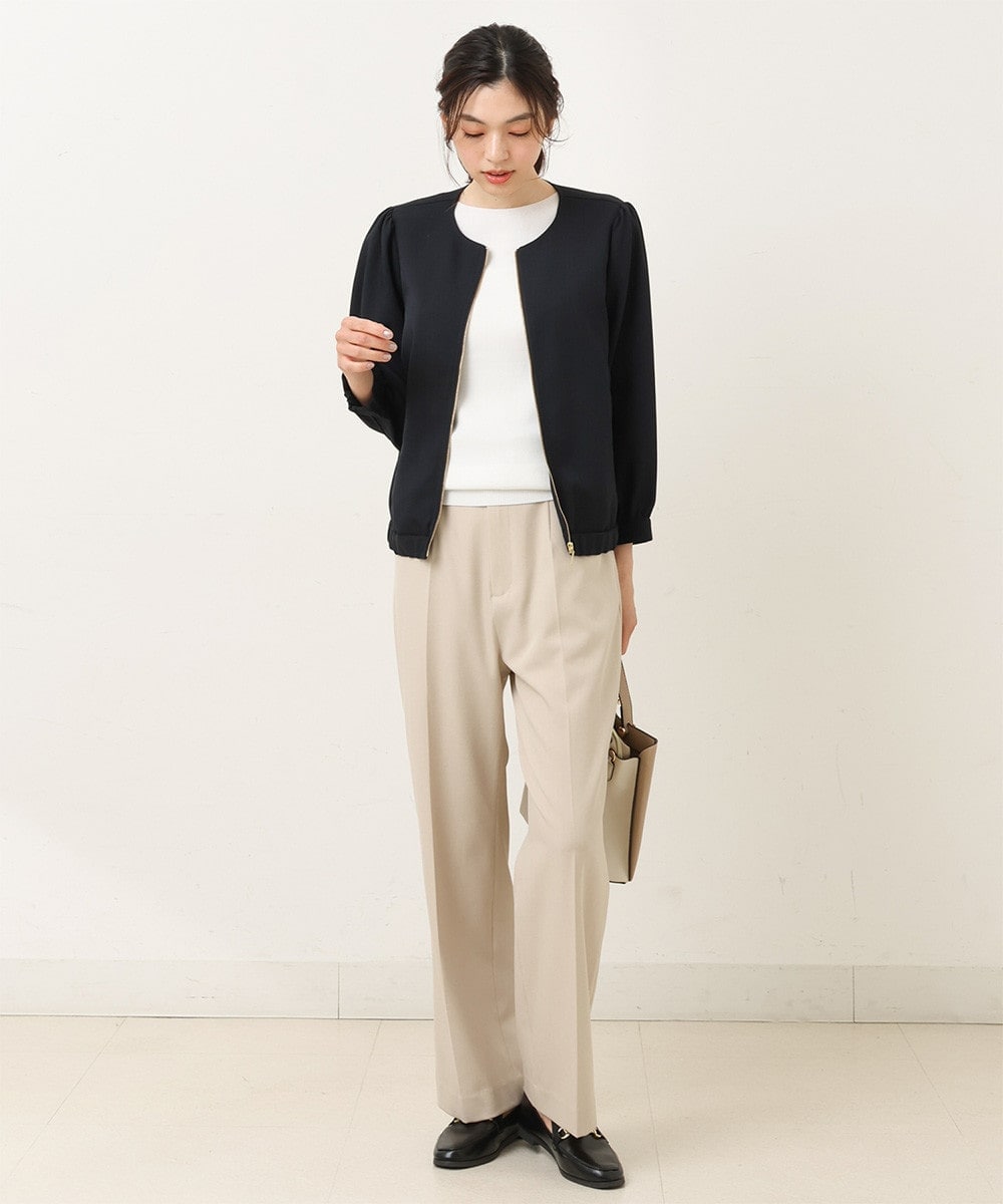 ノーカラーデザインやアイボリーカラーが柔らかで女性らしく、カジュアルすぎない着こなしを叶えます。