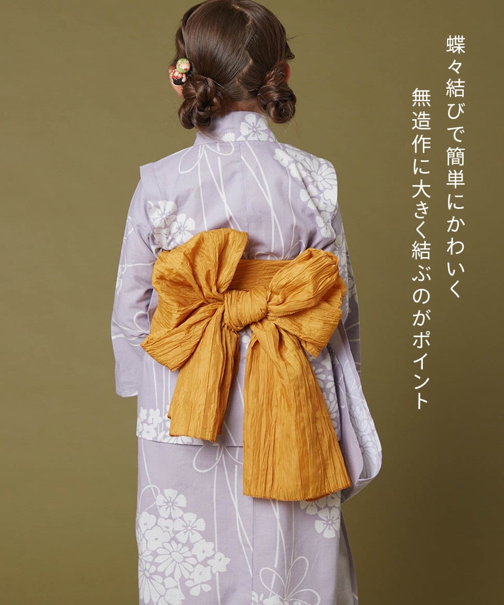 マスタード色の兵児帯はコーデに華やかさをプラス。