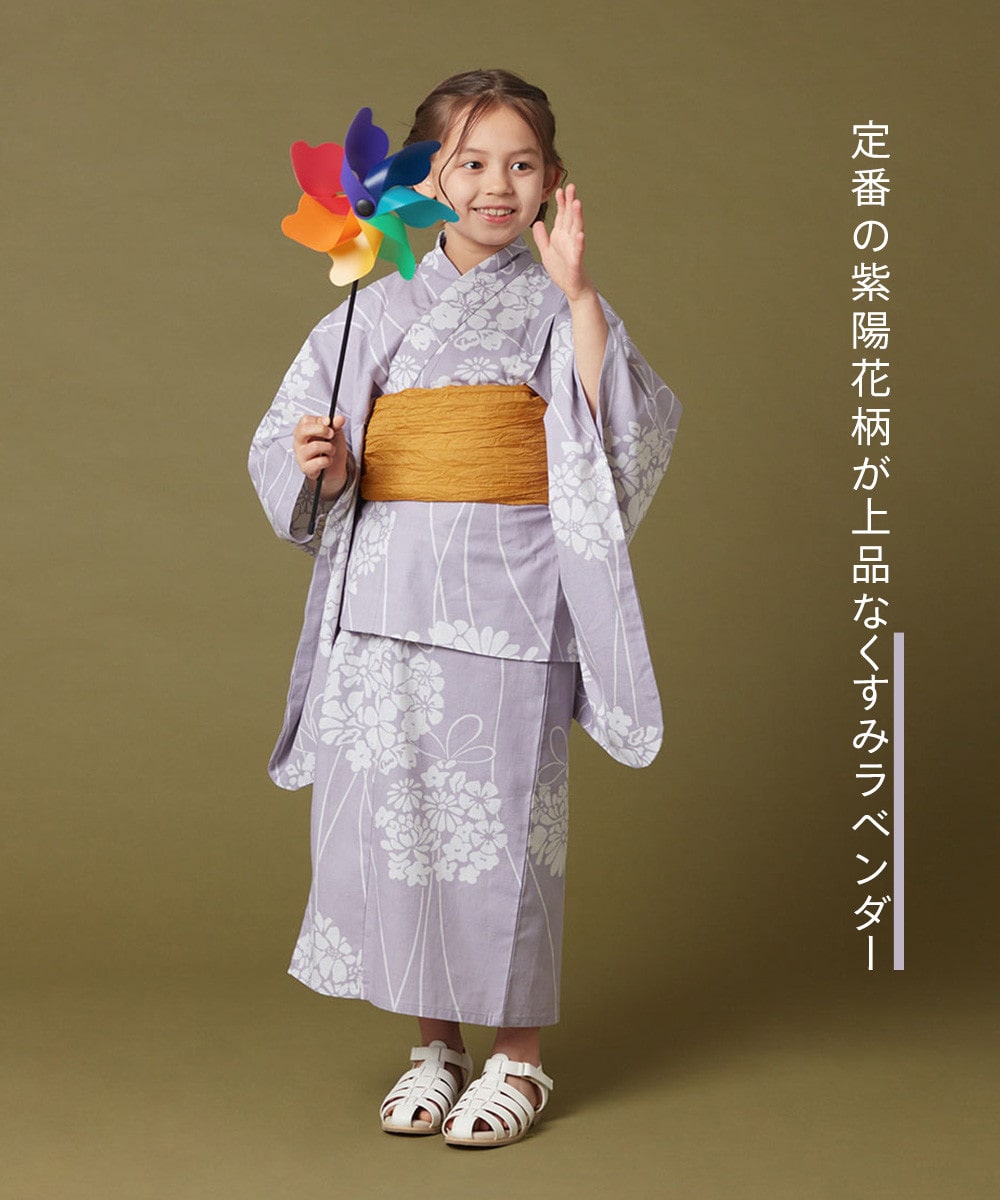 上品な中にかわいさもあるくすみラベンダーの浴衣。