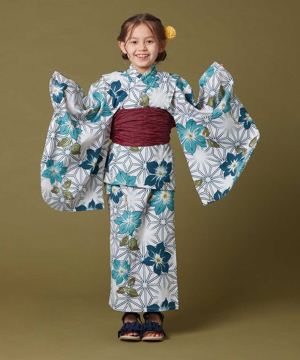 麻の葉文様にお花を施したブルーが涼しげな浴衣×ボルドー色の帯