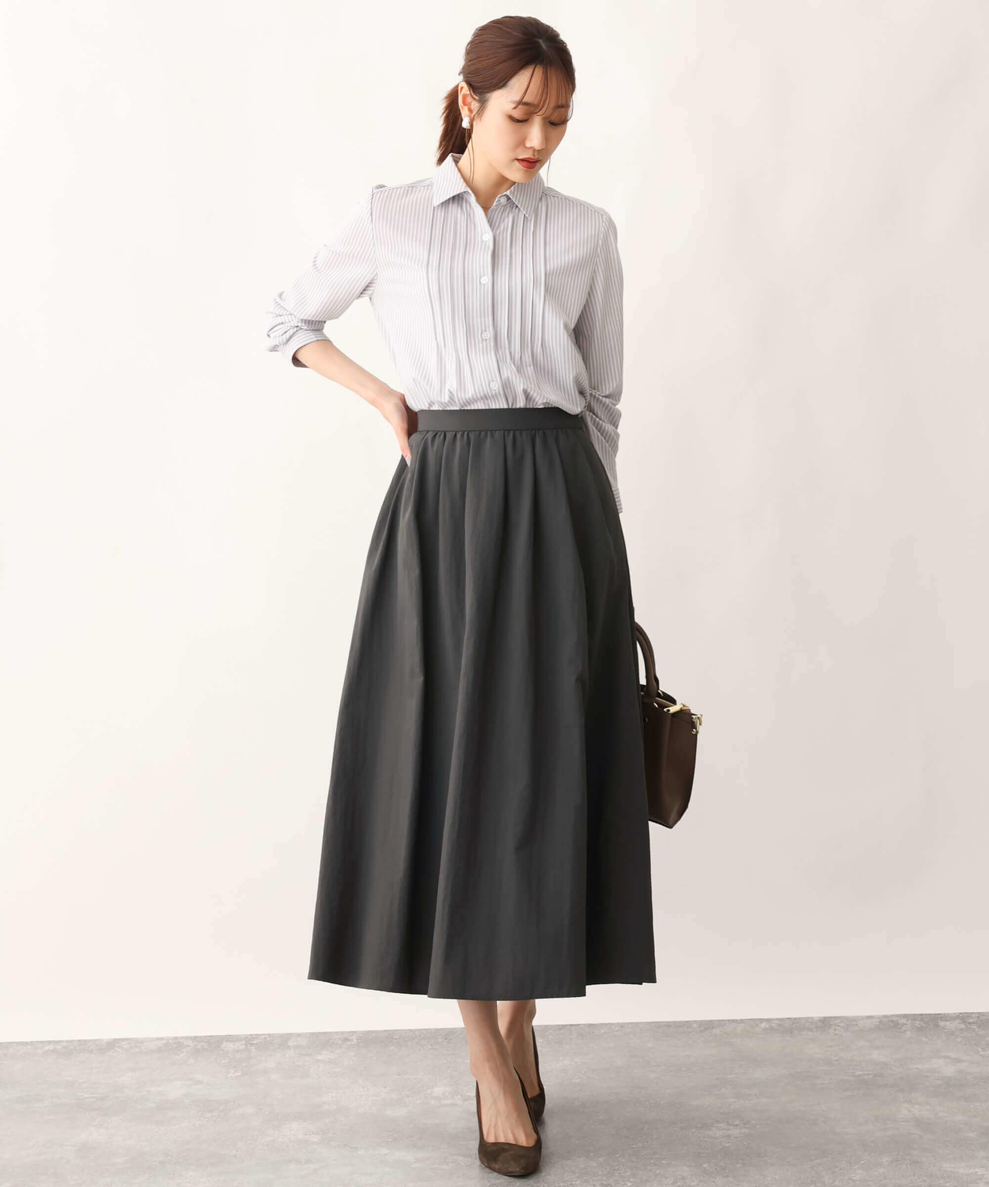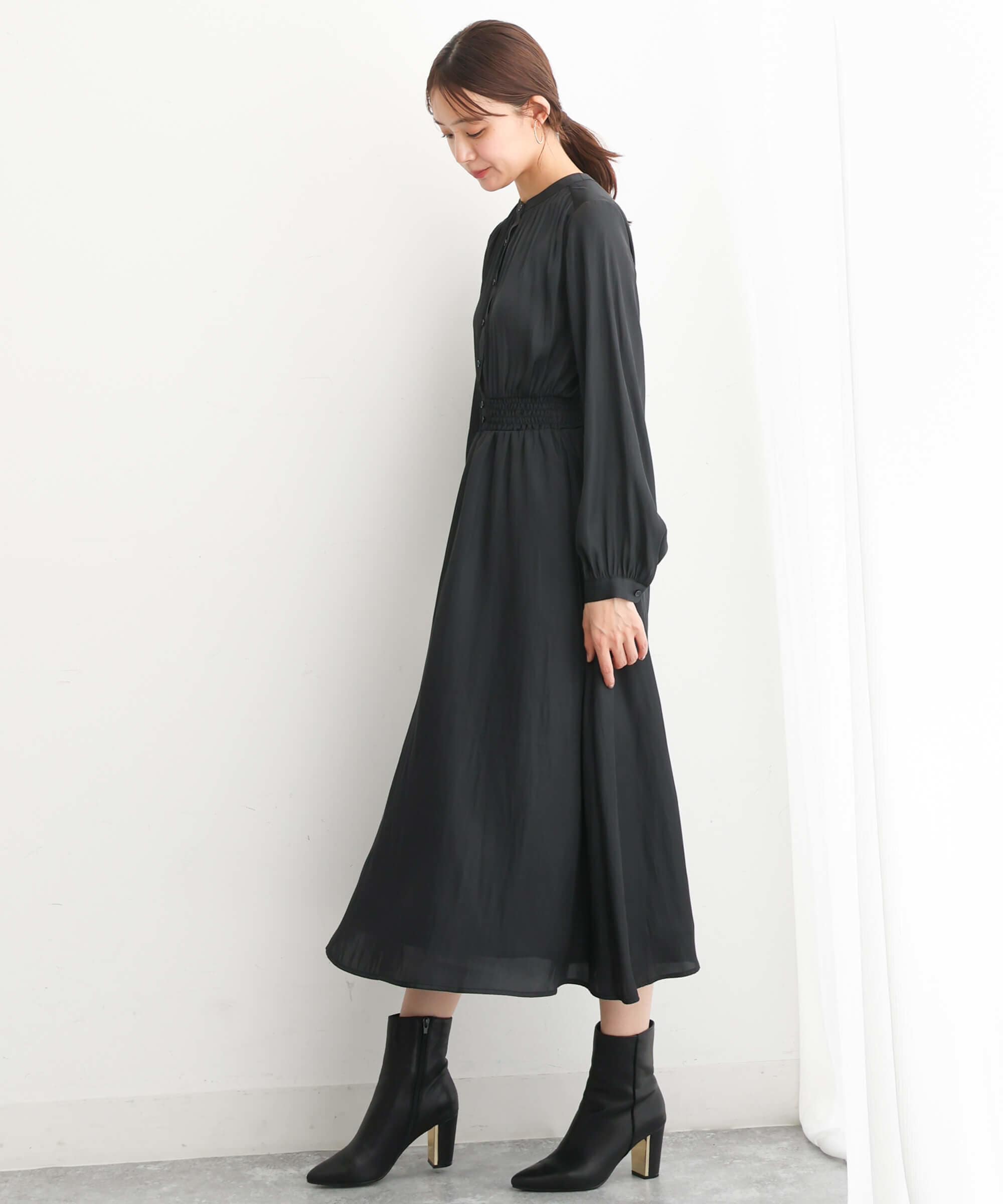 ウエストマークされたワンピースは一枚で決まるシルエットのきれいさが魅力。