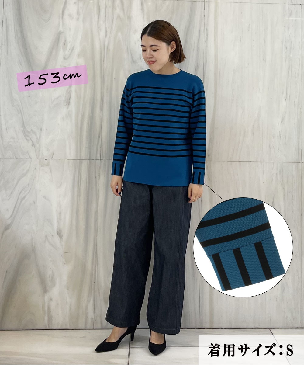 カジュアルな印象のボーダー柄ですが、スパンコール刺繍できれい見えし大人らしい着こなしへと後押ししてくれます。