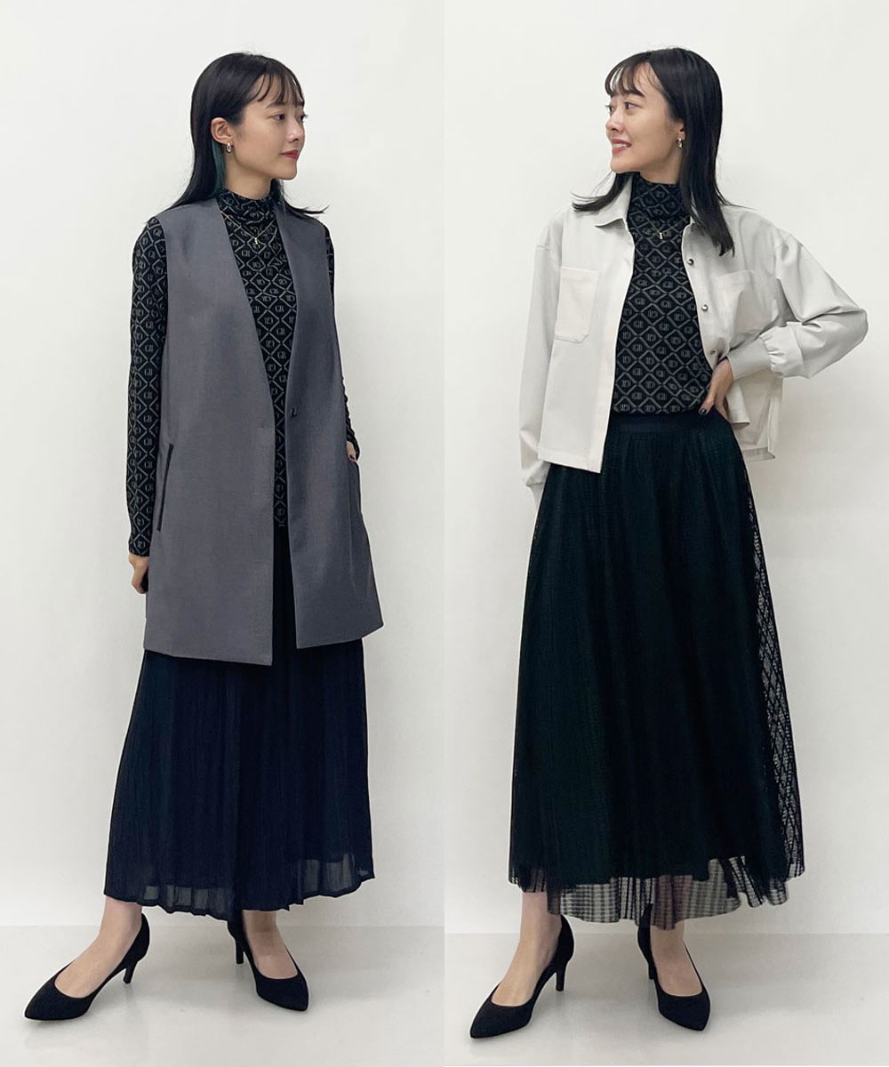 暑さの残る初秋は一枚で、少し肌寒くなっていた日にはチュールのタートルネックと重ね着をしておしゃれ度を高めてみてはいかがでしょうか?