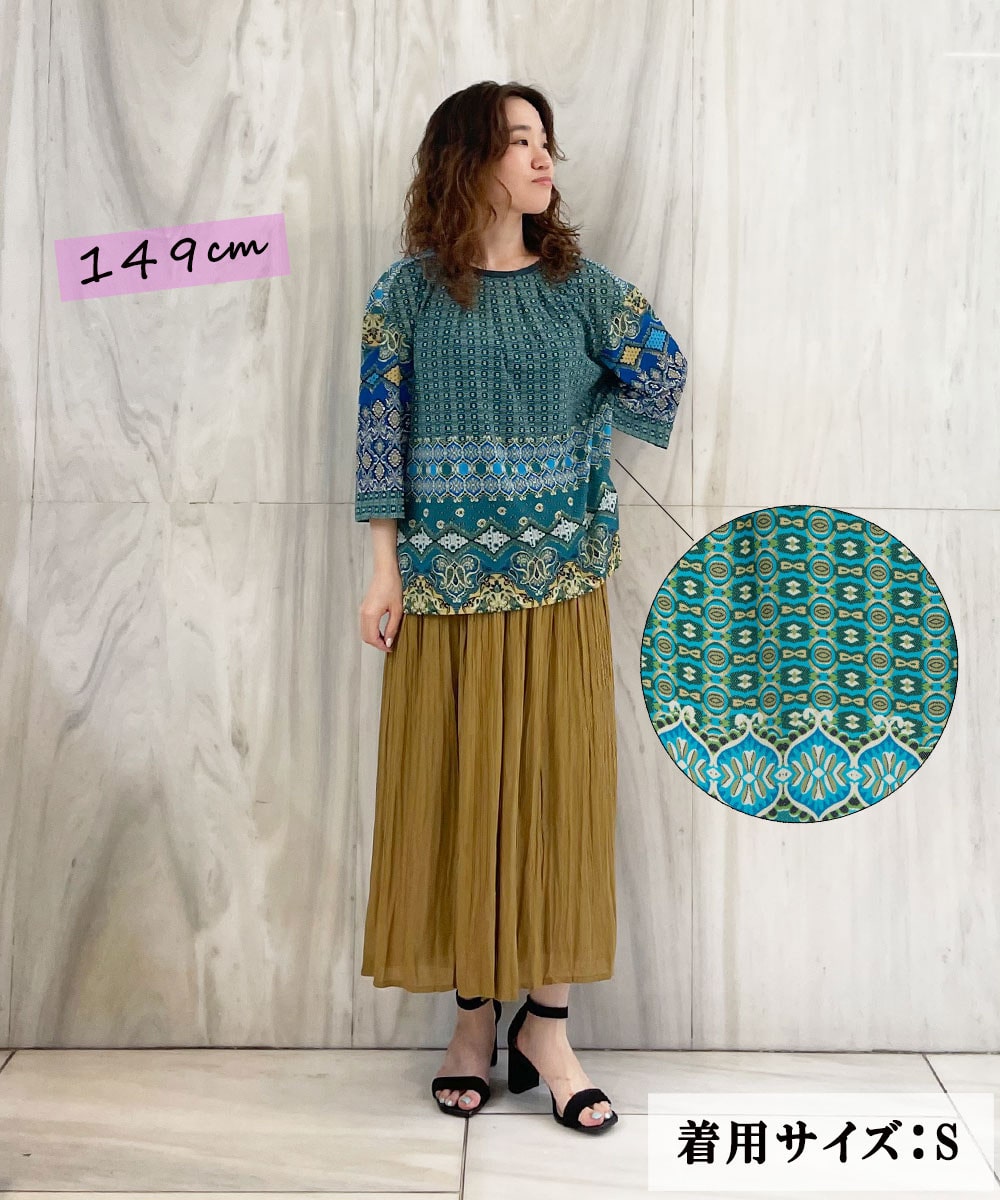 同素材のプルオーバーブラウス。腰周りが隠れるやや短めの着丈です。