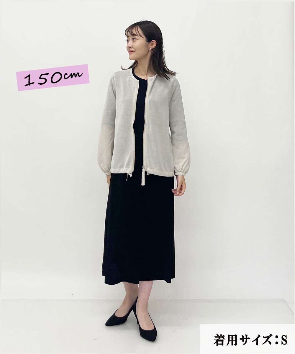 すっきりとコンパクトなシルエットなので前を開けて着ても、閉めてプルオーバー風に着ても女性らしい着こなしに。