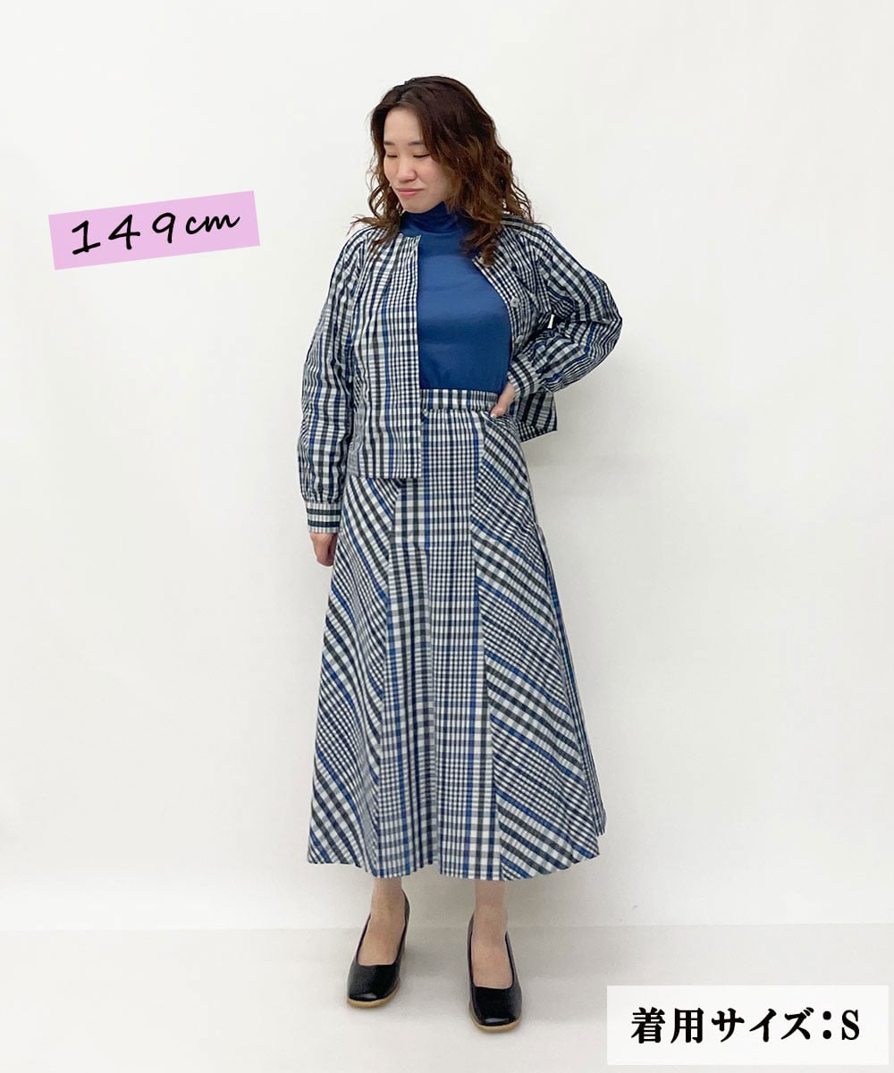 同色のスカート合わせで旬なブルーワントーンコーデでまとめるのもおすすめです。このスタッフのコーディネート一覧はこちらへ>>