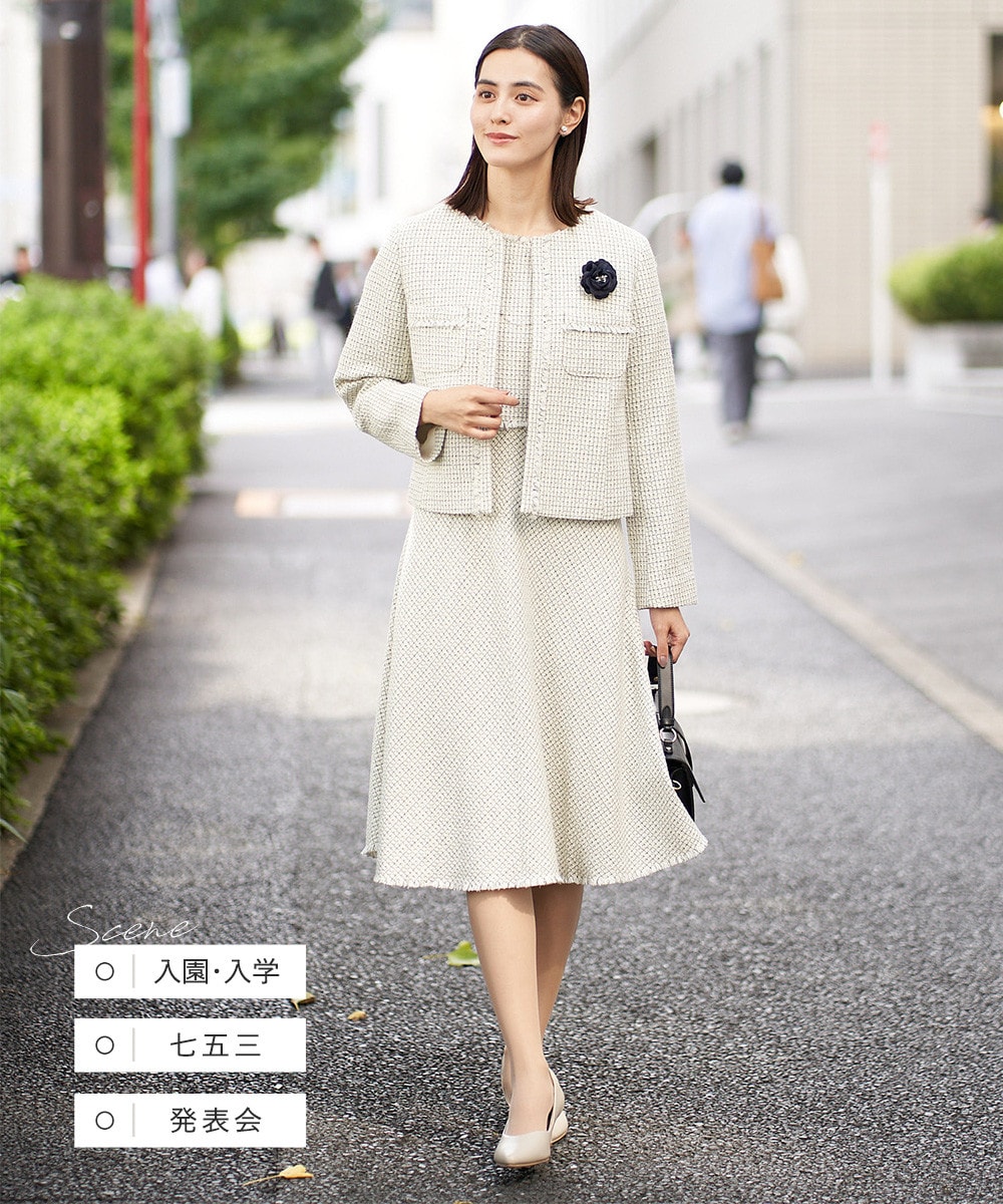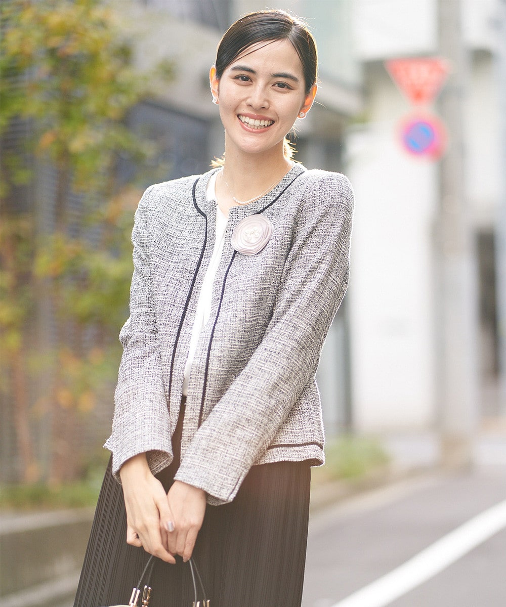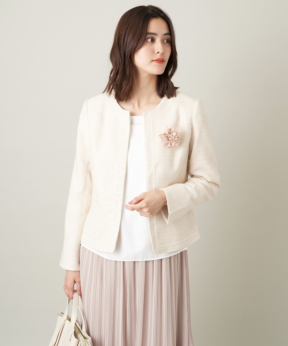 セレモニースタイルの定番ツイードジャケットは、羽織るだけで上品な印象に。