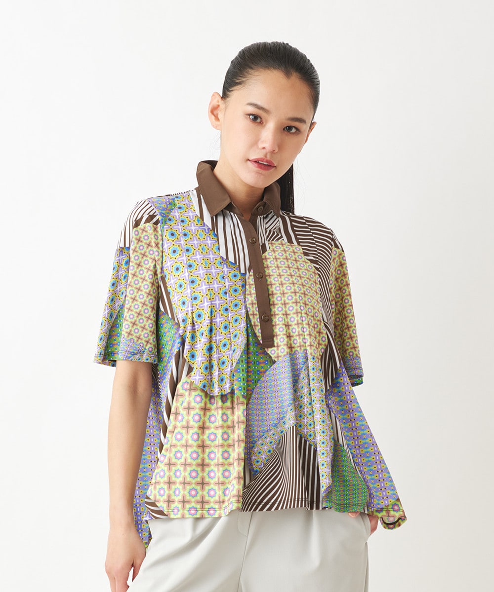 大胆な柄と配色パターンを用いたフェミニンモダンな印象のブラウス。