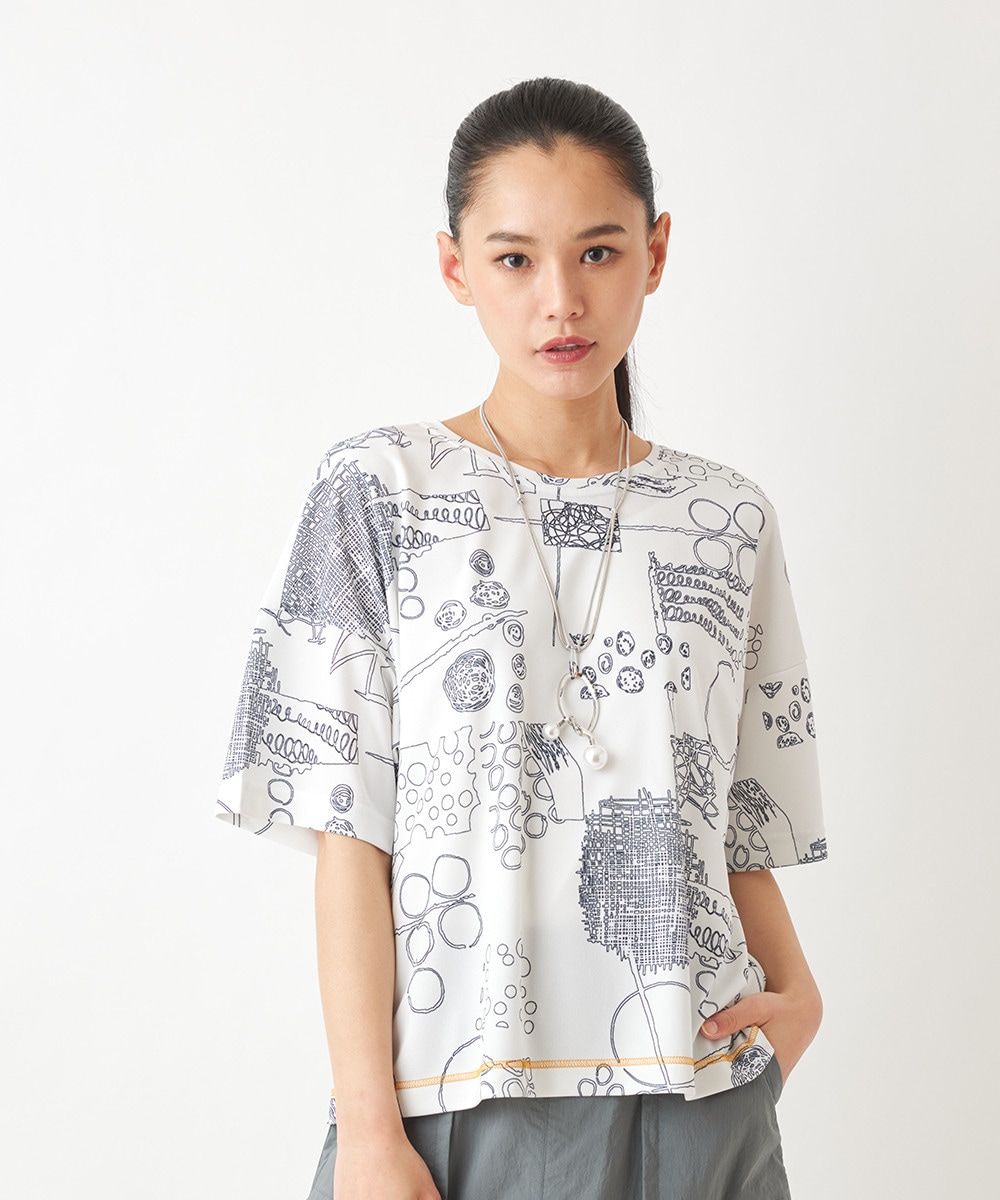 線描きのPOPな幾何学デザインに裾のステッチ配色がBISらしいカットソー。