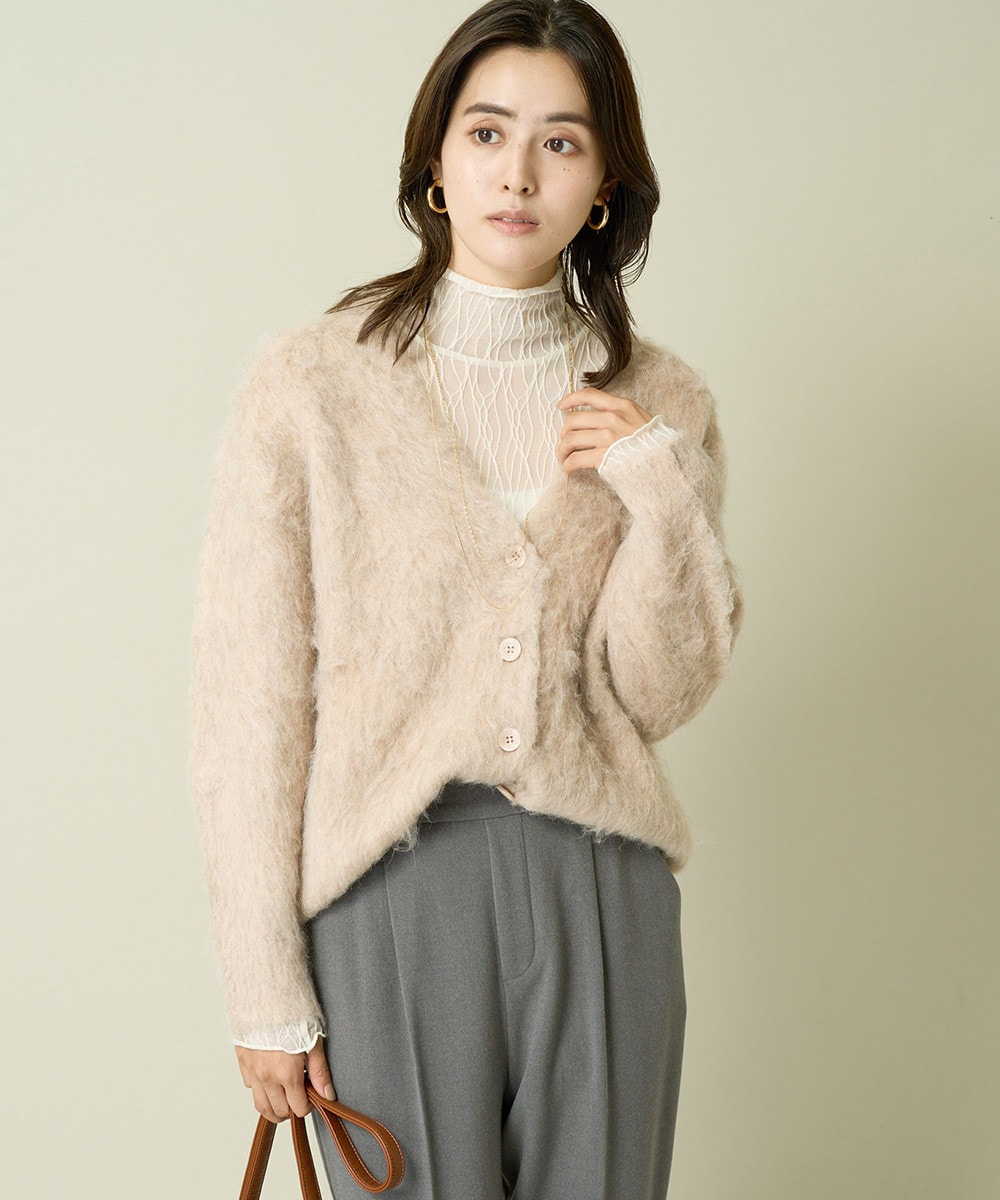 ヘアリー素材にキラリと光るラメがアクセントのVネックニット。