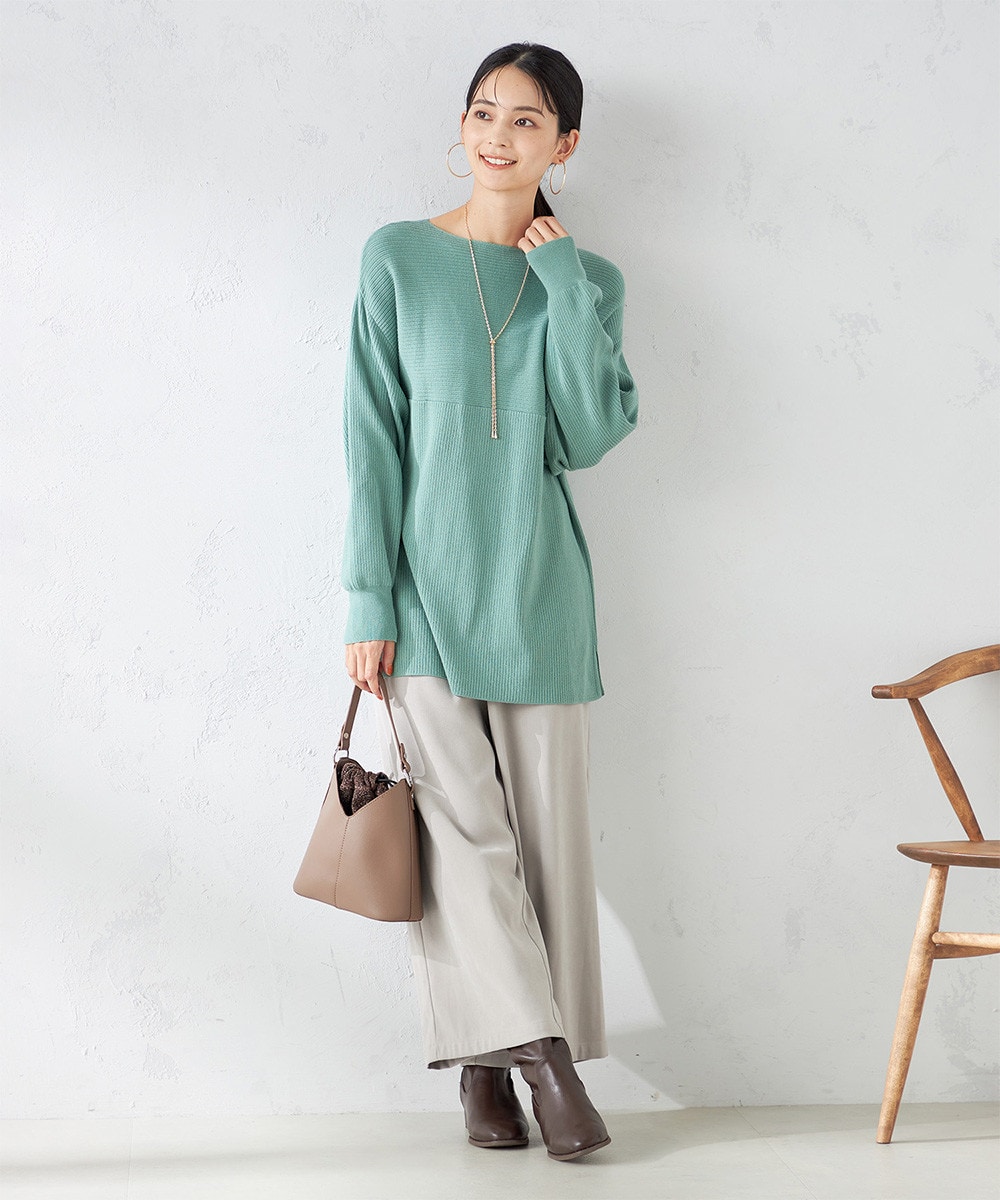 ゆるっとしたシルエットとリブの編地切り替えがポイントのチュニックニット。