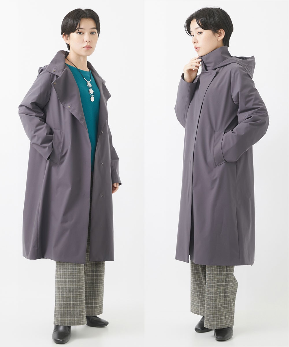 フードを取り外すとコンパクトなスタンドカラーになり印象の違うコートになります。