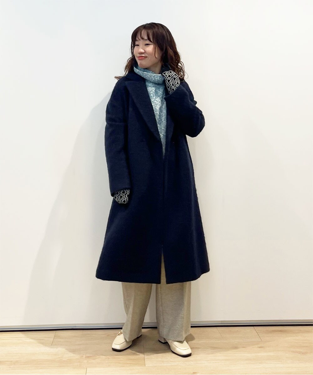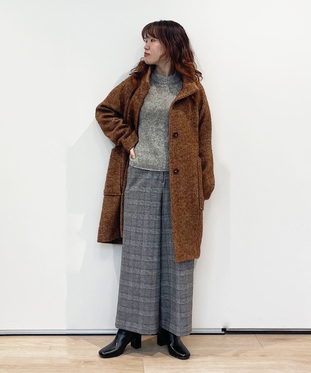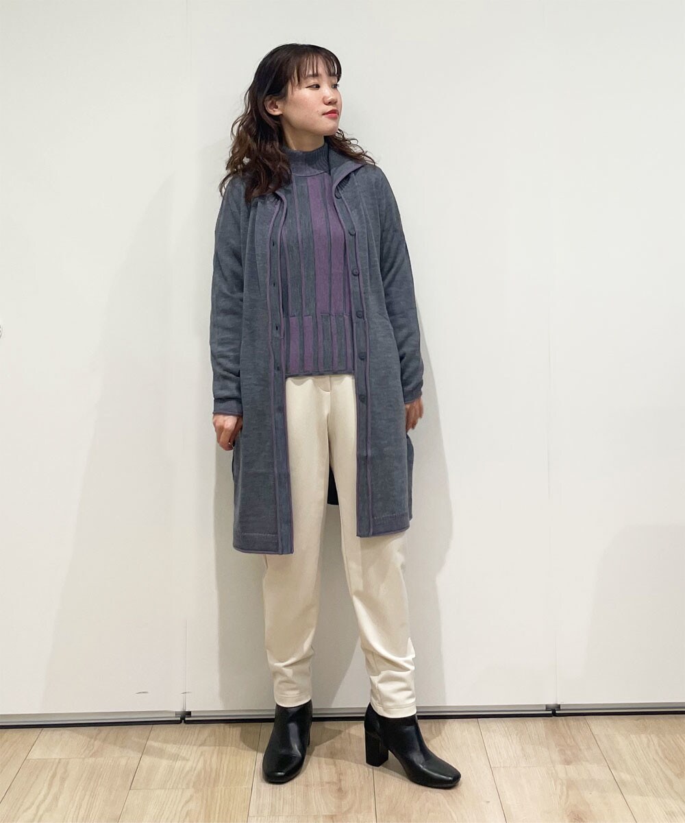 程よく長めの丈なのでパンツを合わせて都会的でスタイリッシュに合わせても素敵に着ていただけます。