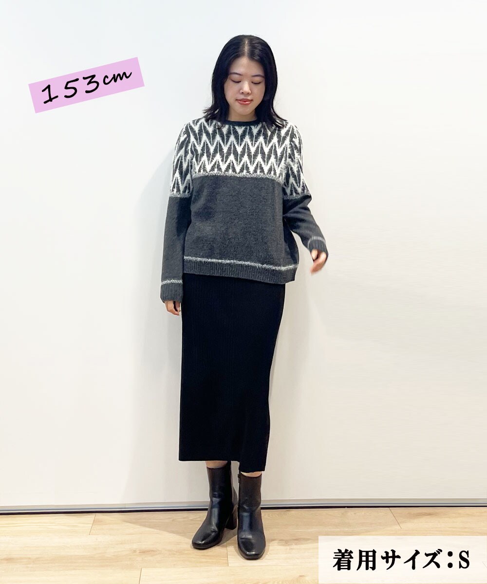 シャギーが映えて顔回りを華やかに見せてくれる柄ニット。毛足が少しあるので柄がぼやけてかわいいらしい仕上がりに。