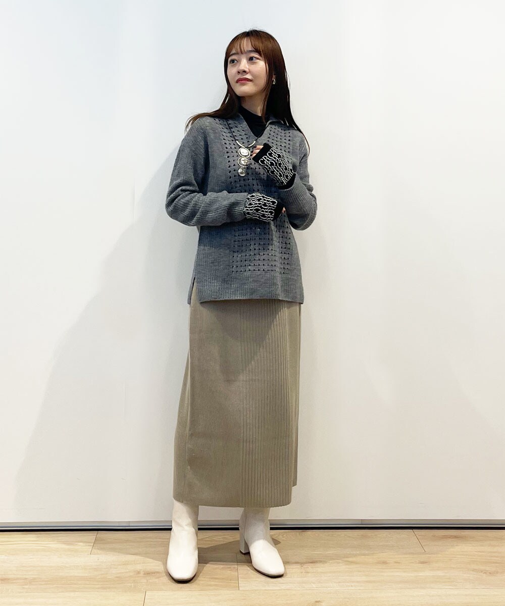 ニット素材なので冷たい印象になりすぎないところもこれからの季節に取り入れやすいですよ。