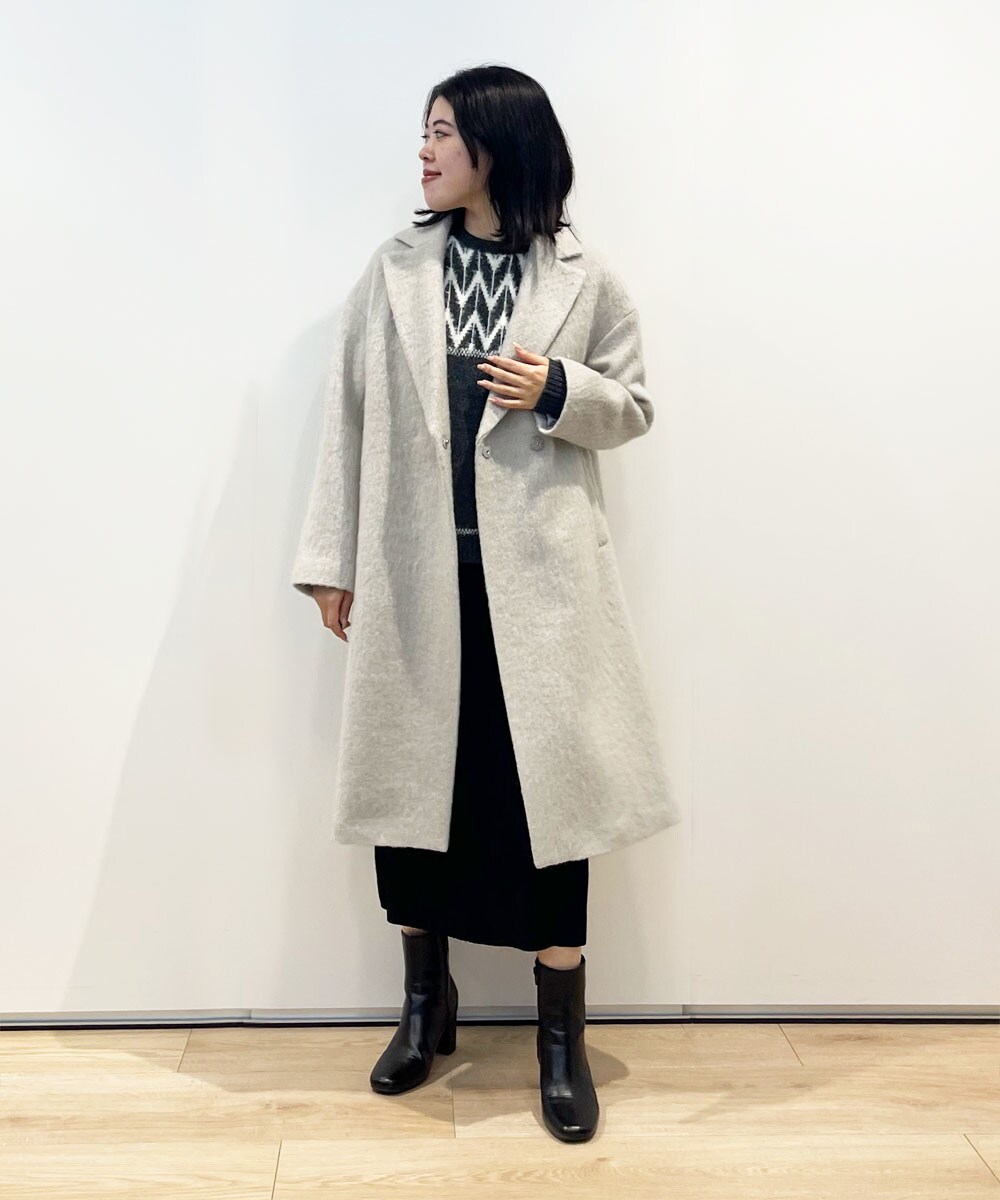 大人っぽく黒のタイトスカートとシャギーロングコートと合わせてきれいめでモダンな印象に。
