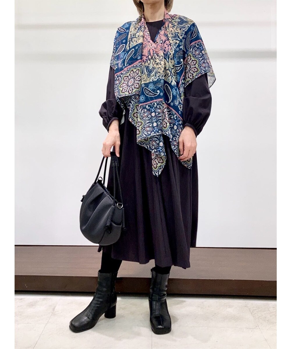 今回は襟を外したスタイリングで、襟元には大判のスカーフを使って華やかさをプラス。巻き方で印象が変わります。