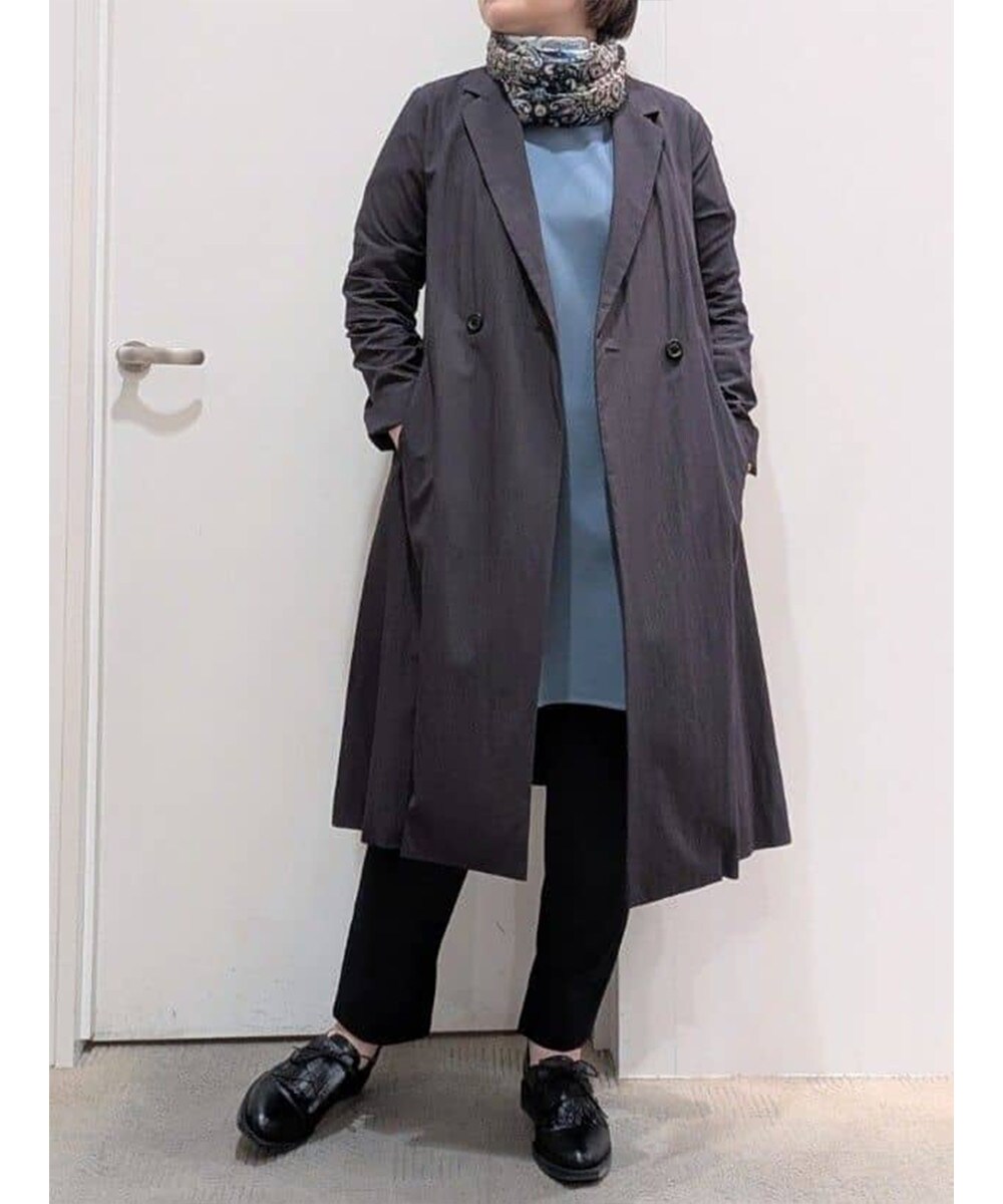 テーラーの襟が細長く、顔周りをスッキリ見せてくれるコートはバックスタイルのベルトデザインが特徴的でシャープな印象に。