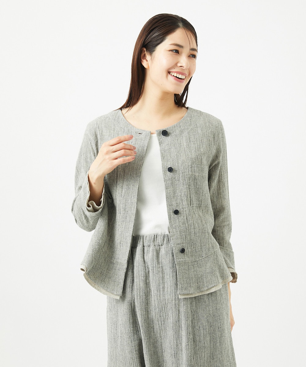 日常だけではなく、ちょっとしたイベントや通勤などにも活用できる大人のセットアップ。リネンが入った春夏らしい素材感でカチッとしすぎず使いやすい。忙しい毎日にコーディネートに悩まず、おしゃれに決まる便利なアイテム。