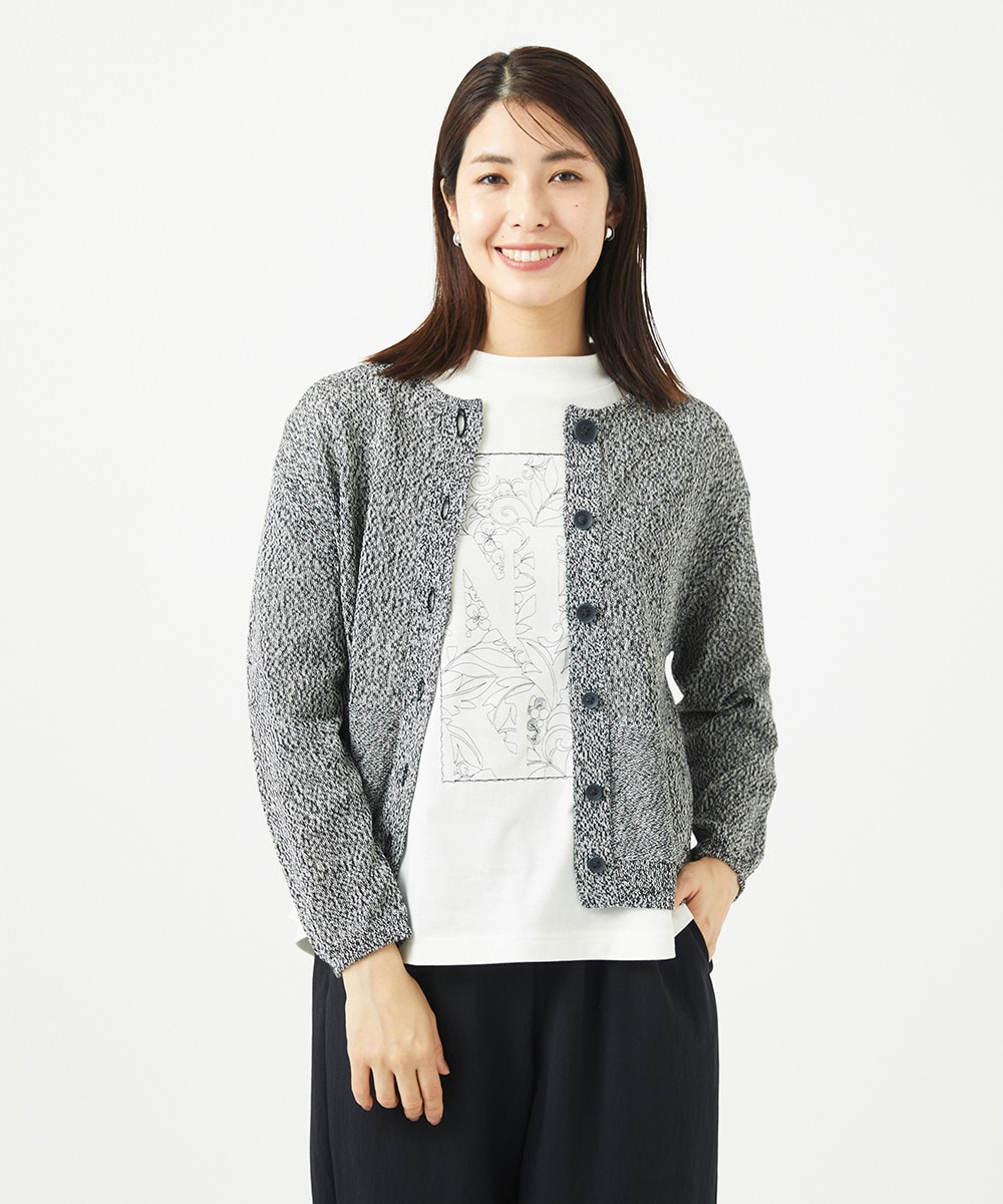 ホワイトのカットソー、ブラック系のパンツ、グレーのカーディガンというシンプルな合わせ。シンプルだからこそ、1点1点アイテムのこだわりが見えるコーディネート。上質な素材とバランスの良いサイズ感でしっかりとおしゃれ見え。