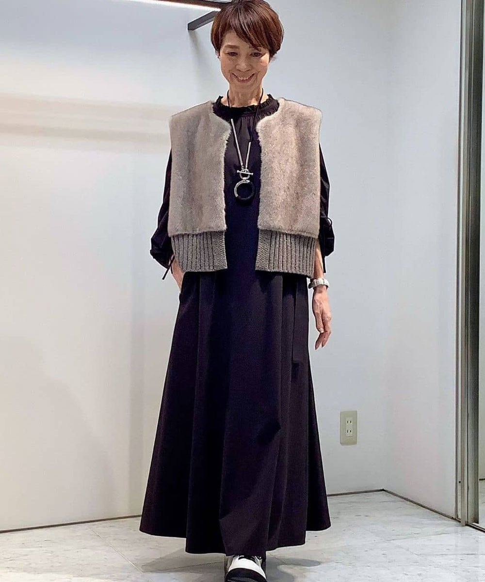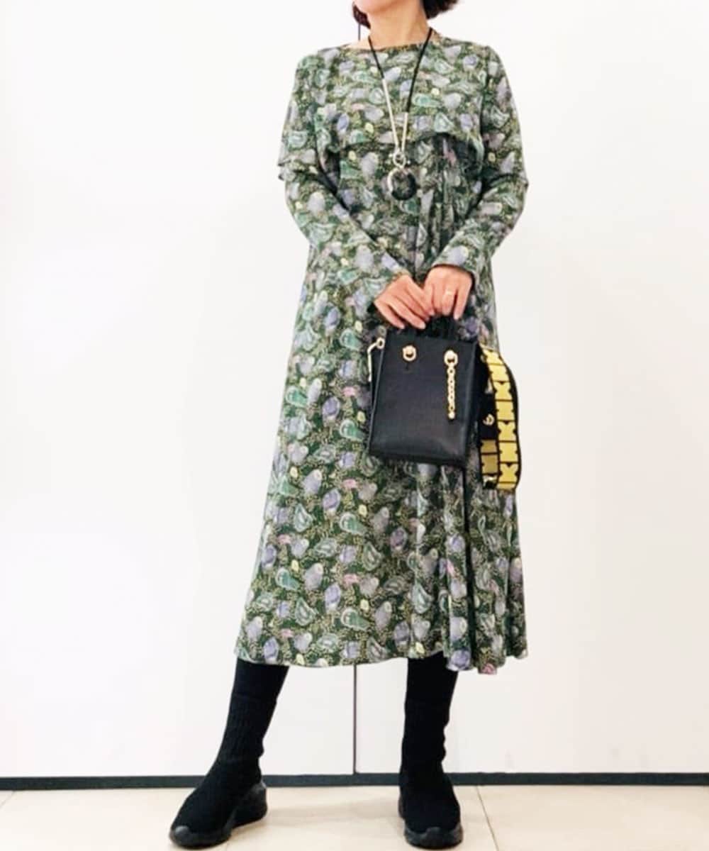 ブラックを基調にしたデザインは、観劇や食事会、ランチ会などのシーンでもエレガントに映える一着です。