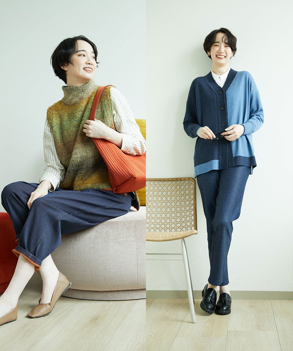 ニット羽織りはロング丈で、切り替えデザインがカジュアルすぎずキレイ見えします。