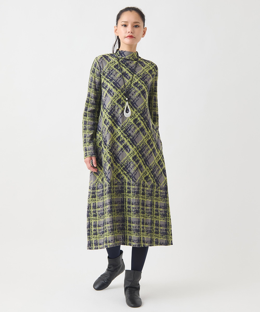身頃のバイアス柄と袖・裾の縦チェック柄との大胆なコントラストが着映えを叶え、一枚で存在感のある着こなしが完成。