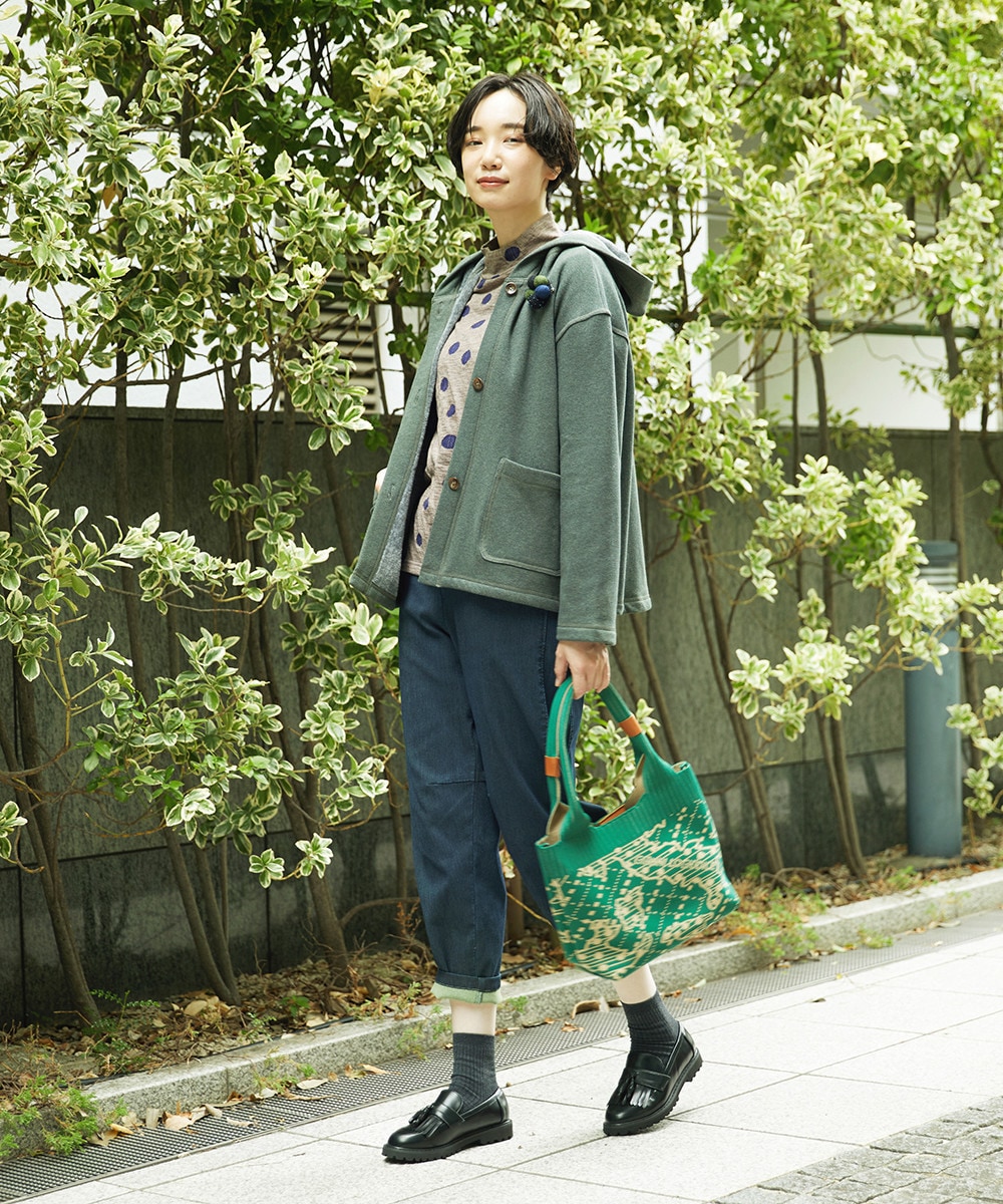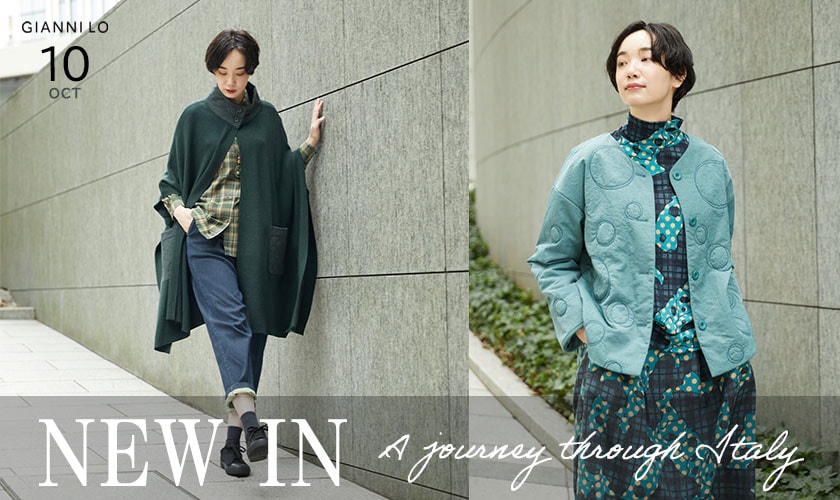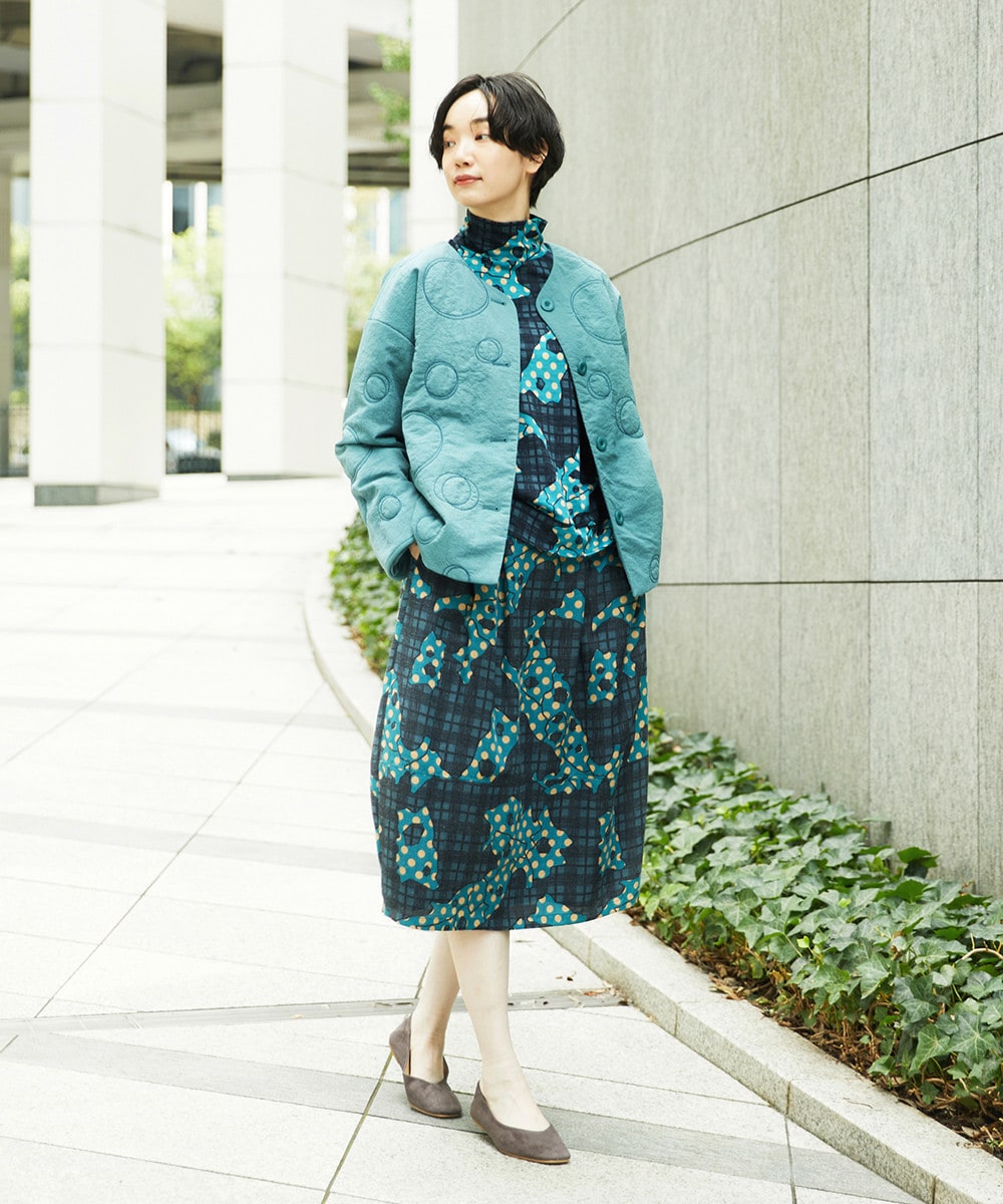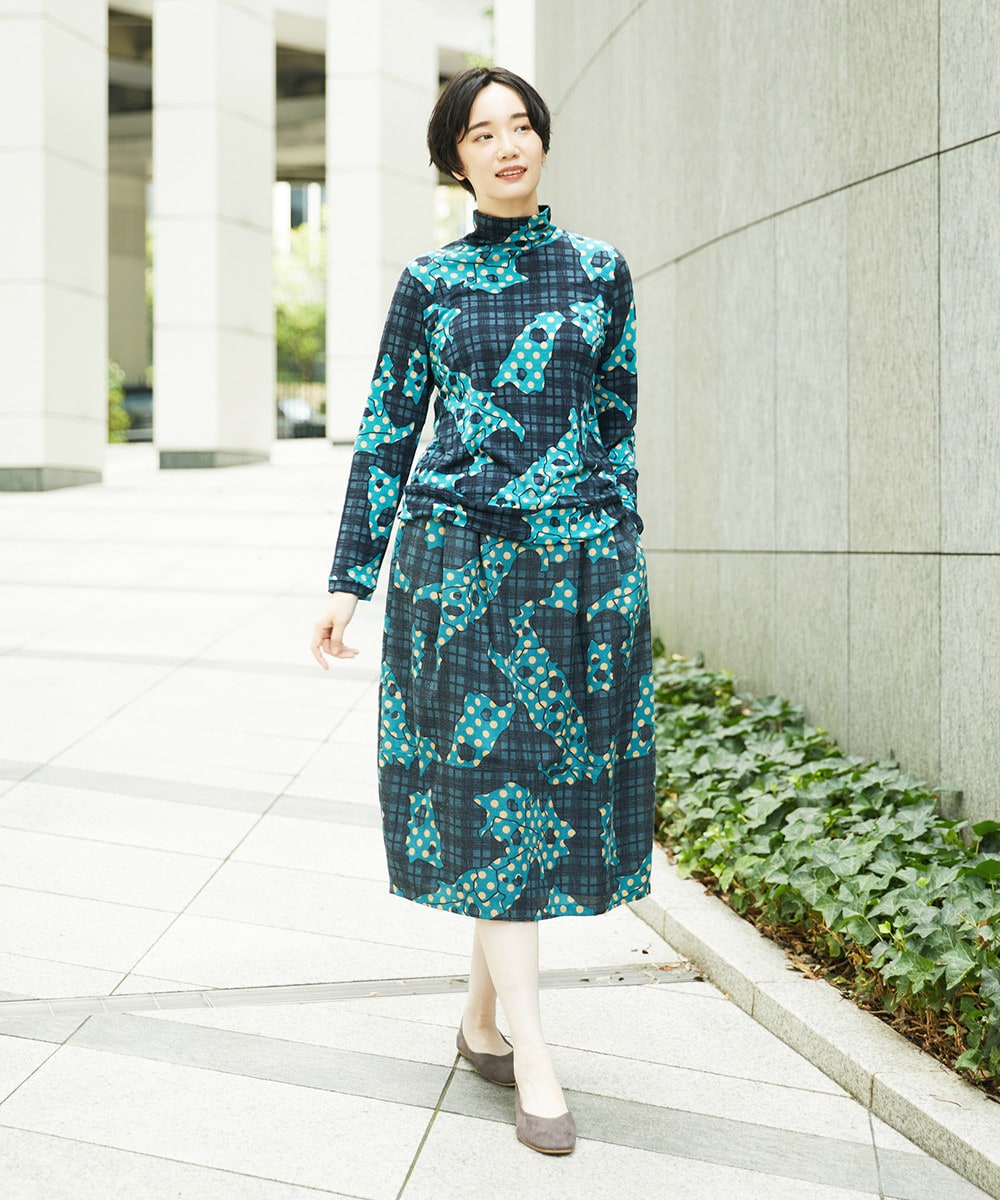 イタリア半島をモチーフにした柄で存在感のあるセットアップ。着映えし衣装感がありながらも、ウール100%のほっこりとした素材感が使いやすい。上着もブルー系で合わせ、まとまりのある印象に。褒められること間違いなし。