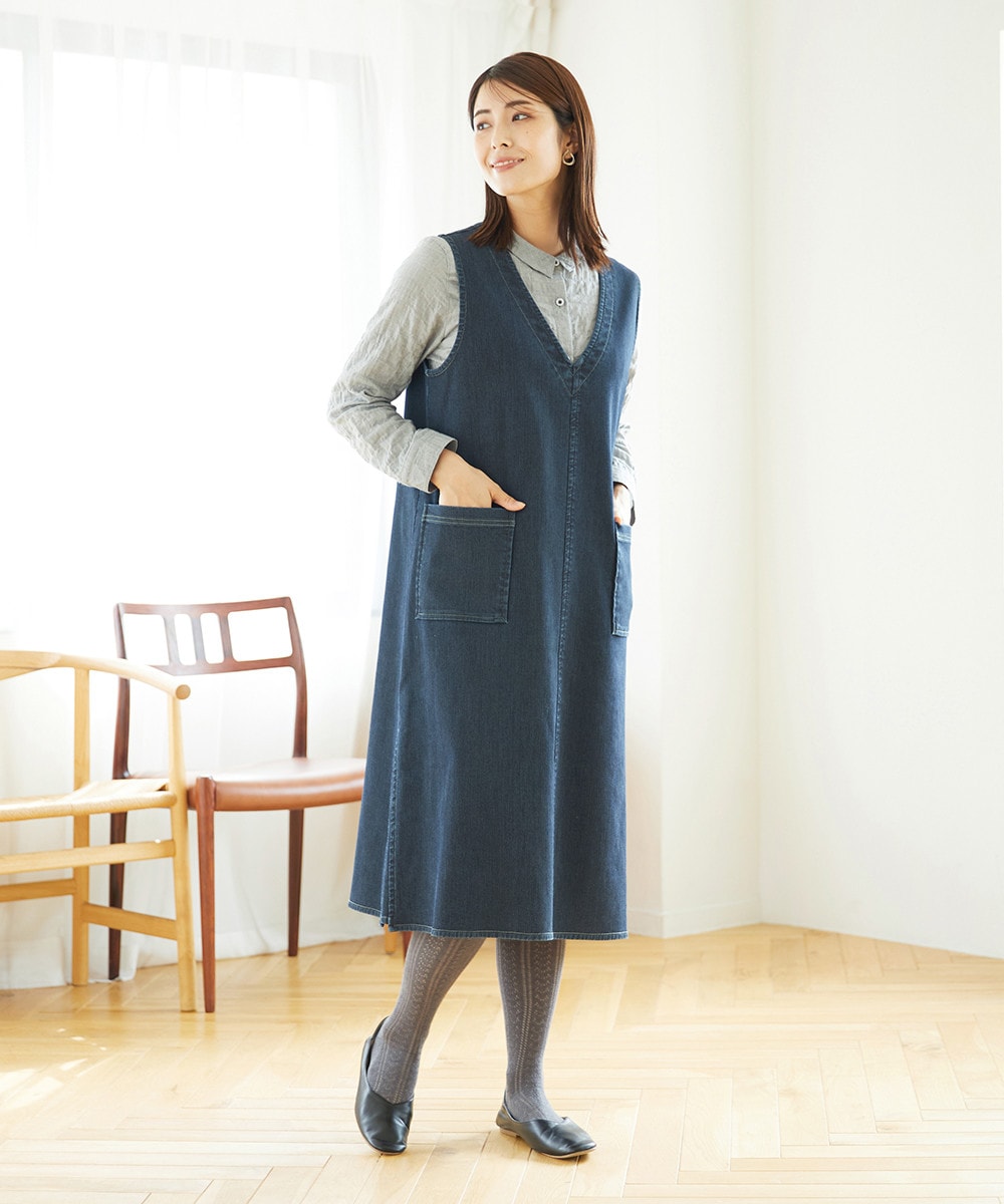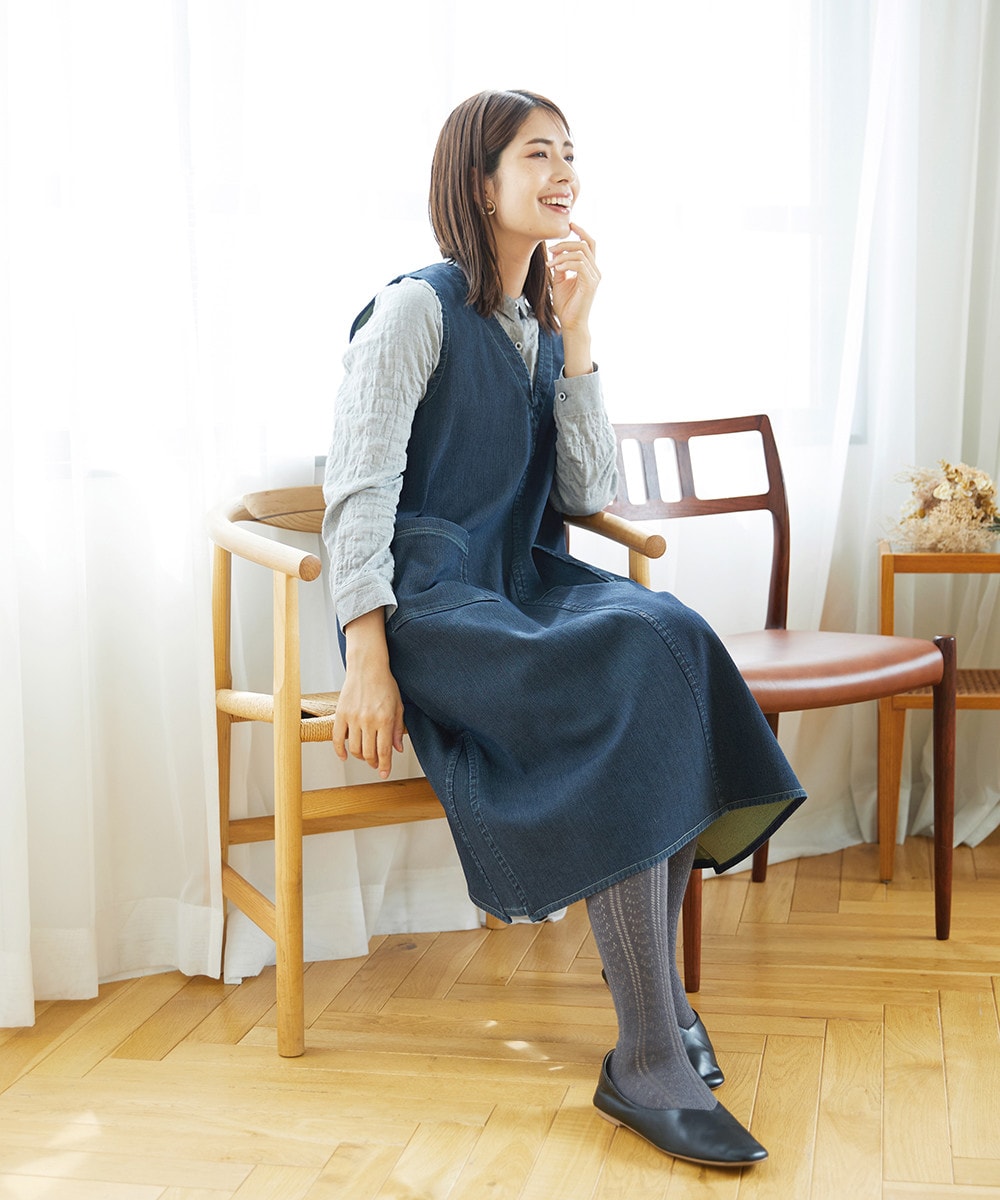 インディコ素材を使用したジャンバースカート。縦ラインをきれいに見せながら、カチッとしすぎず、甘すぎず、大人かわいい雰囲気を演出。インナーには襟付きブラウスを合わせて上品な印象に。