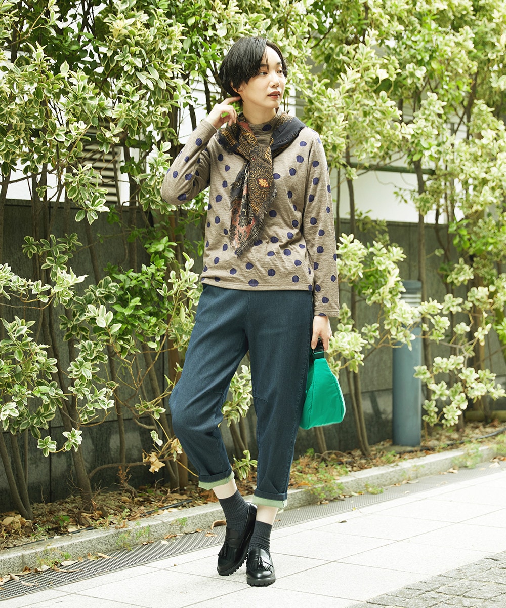 優しいニュアンスカラーの水玉トップスとパーカーで、色合いからも秋らしさを感じるスタイリング。軽羽織りがあれば肌寒い朝晩にも安心。楽ちんな装いにも、小物でアクセントをつければグッとおしゃれ見えしてこなれた印象に。