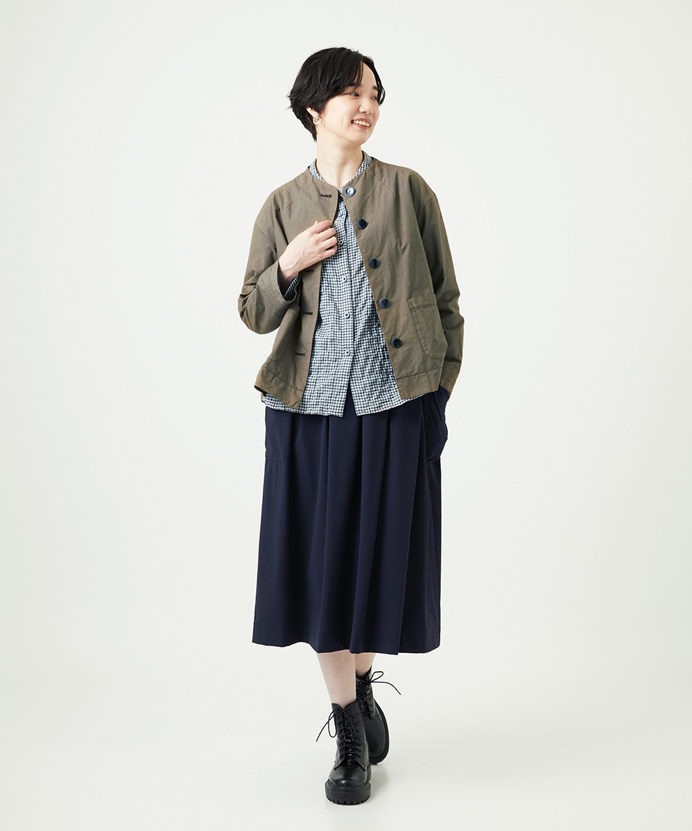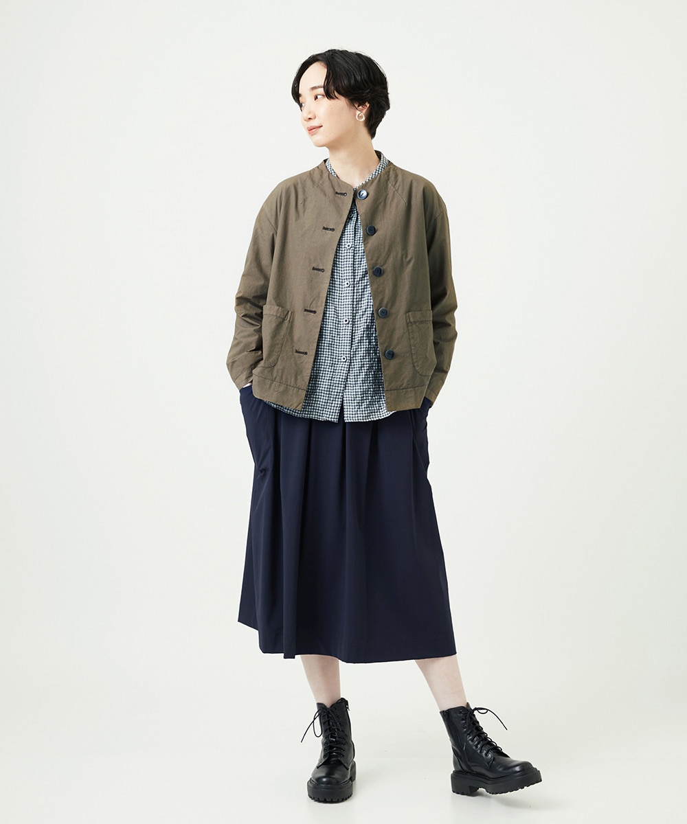 味のある色で大人カジュアルに決まるショートジャケットは、一気に季節感を出してくれるアイテム。ブラウスとスカートに合わせて、女性らしくもシック雰囲気に。