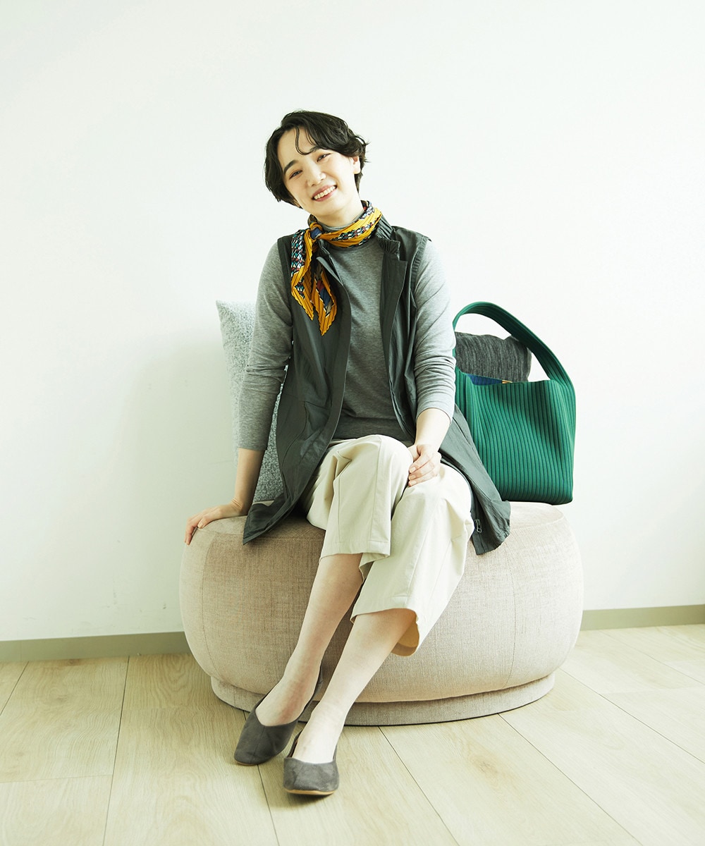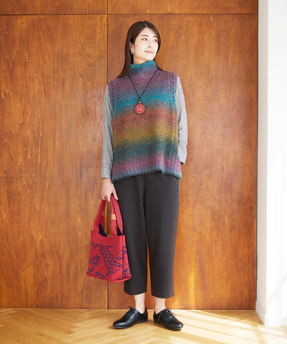 色使いが魅力的なベストニットは、軽やかで動きやすさ抜群なうえ、しっかりおしゃれ見えしてくれるアイテム。インナーはチェック柄のブラウスで柄合わせを楽しんで。赤い雑貨を添えてアクセントに。