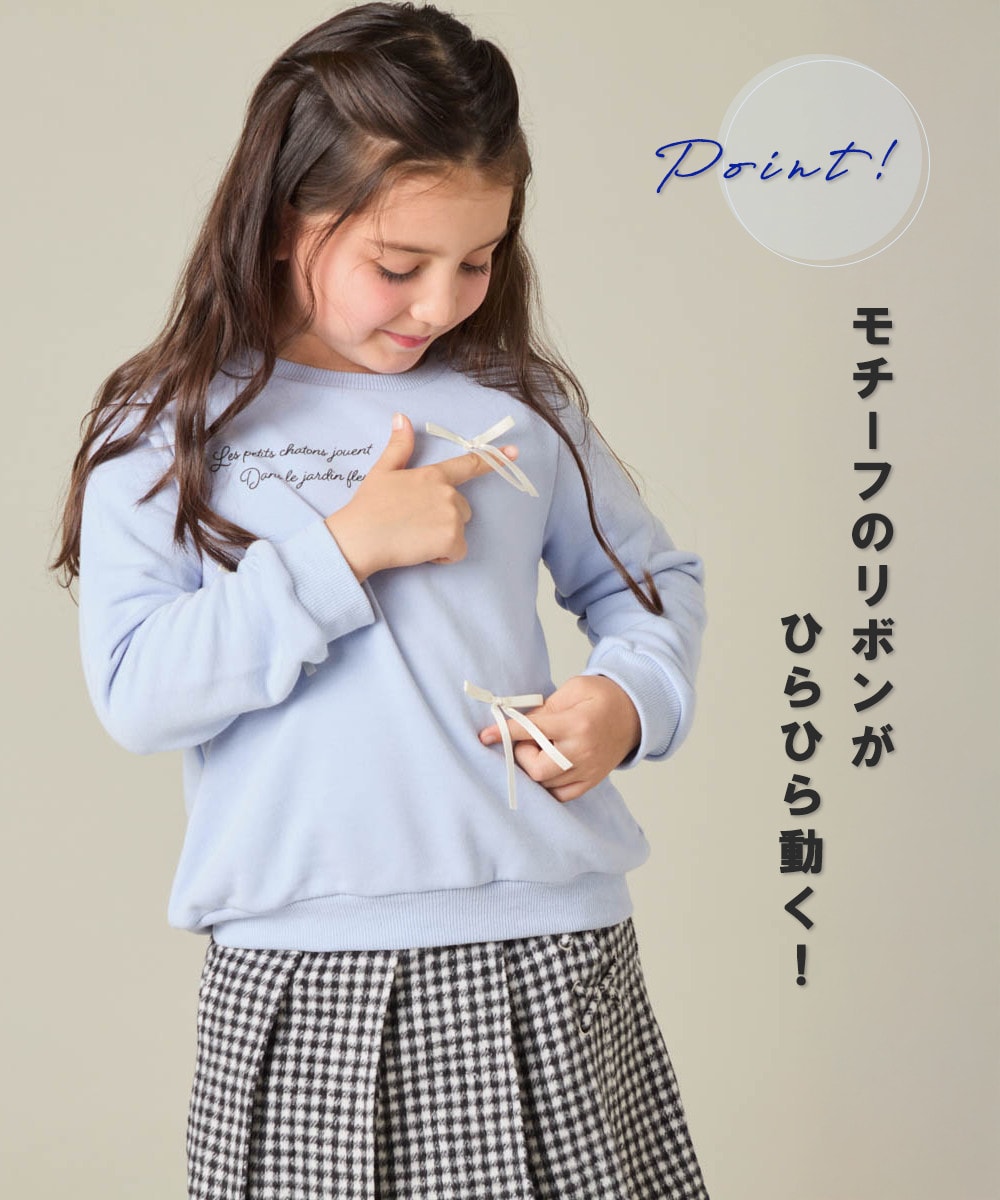 前身頃に配色サテンリボンをあしらったガーリースウェット。