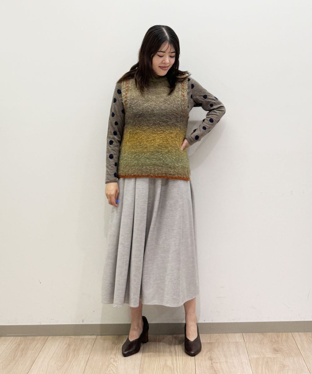 シーズンムードを高めてくれる、グラデーションニットベストと合わせて鮮度感のある着こなしに。