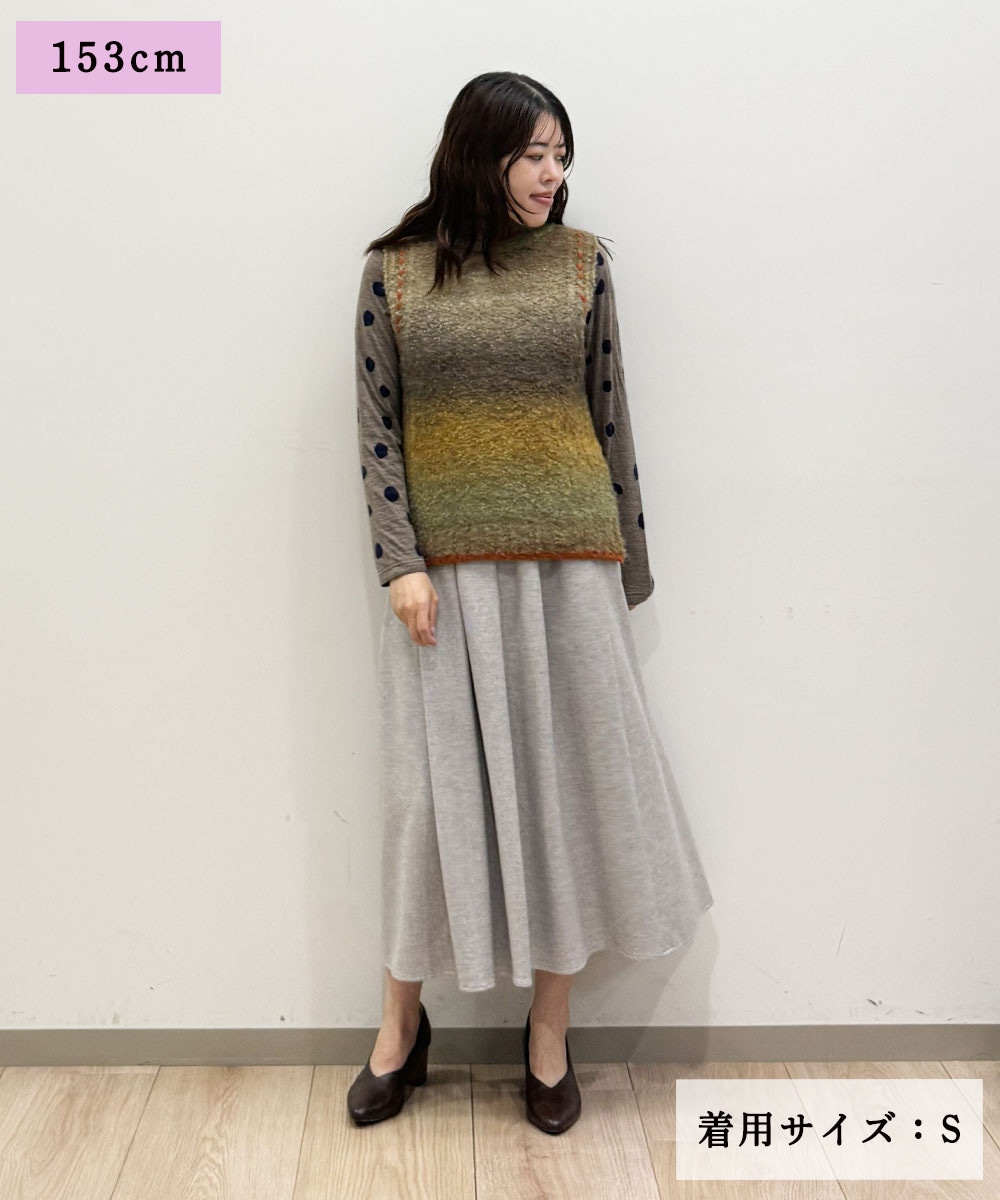 トレンドのシャギー素材のニットベストに、二重織りガーゼのチェックのスカートを合わせました。