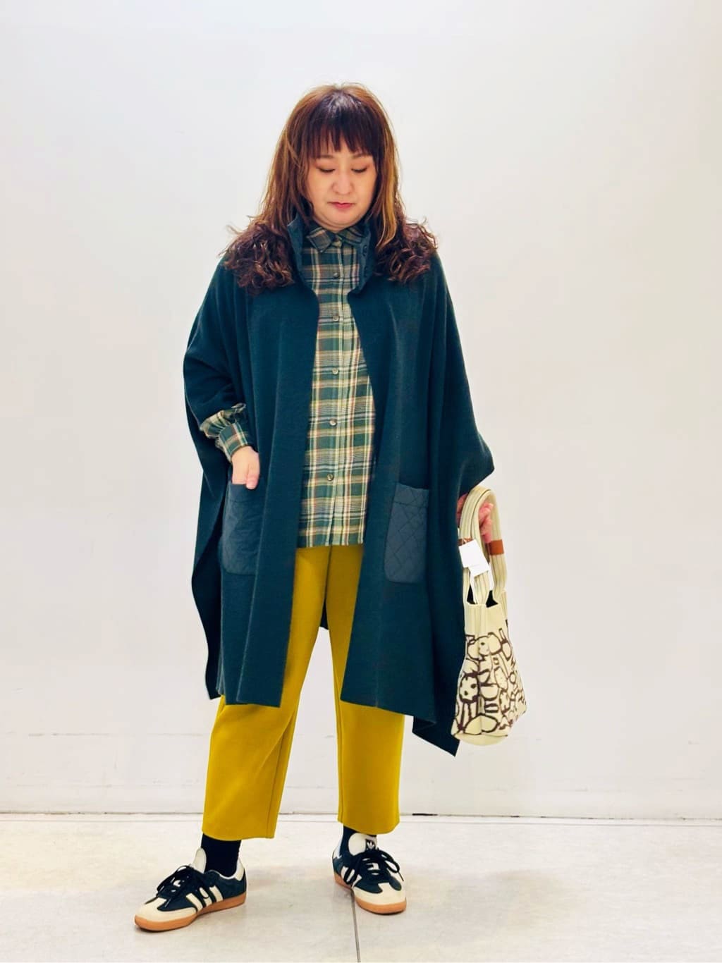 パンツはウエストゴムでリラックスコーデや休日のお出かけに最適。丸みのあるシルエットは、下半身太めでも気にならず、美しいラインを演出します。羽織るだけで垢抜けた印象を与えるニットポンチョや、深みのあるオリジナルチェック柄のブラウスもおすすめ。季節の変わり目にぴったりな大人カジュアルスタイルが完成です。