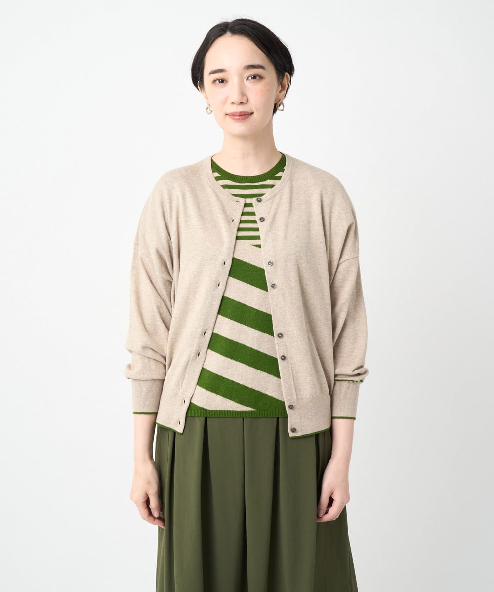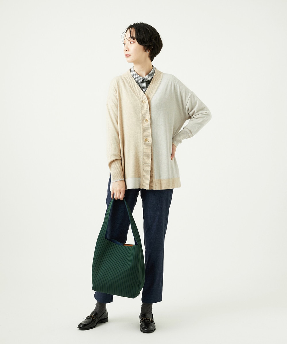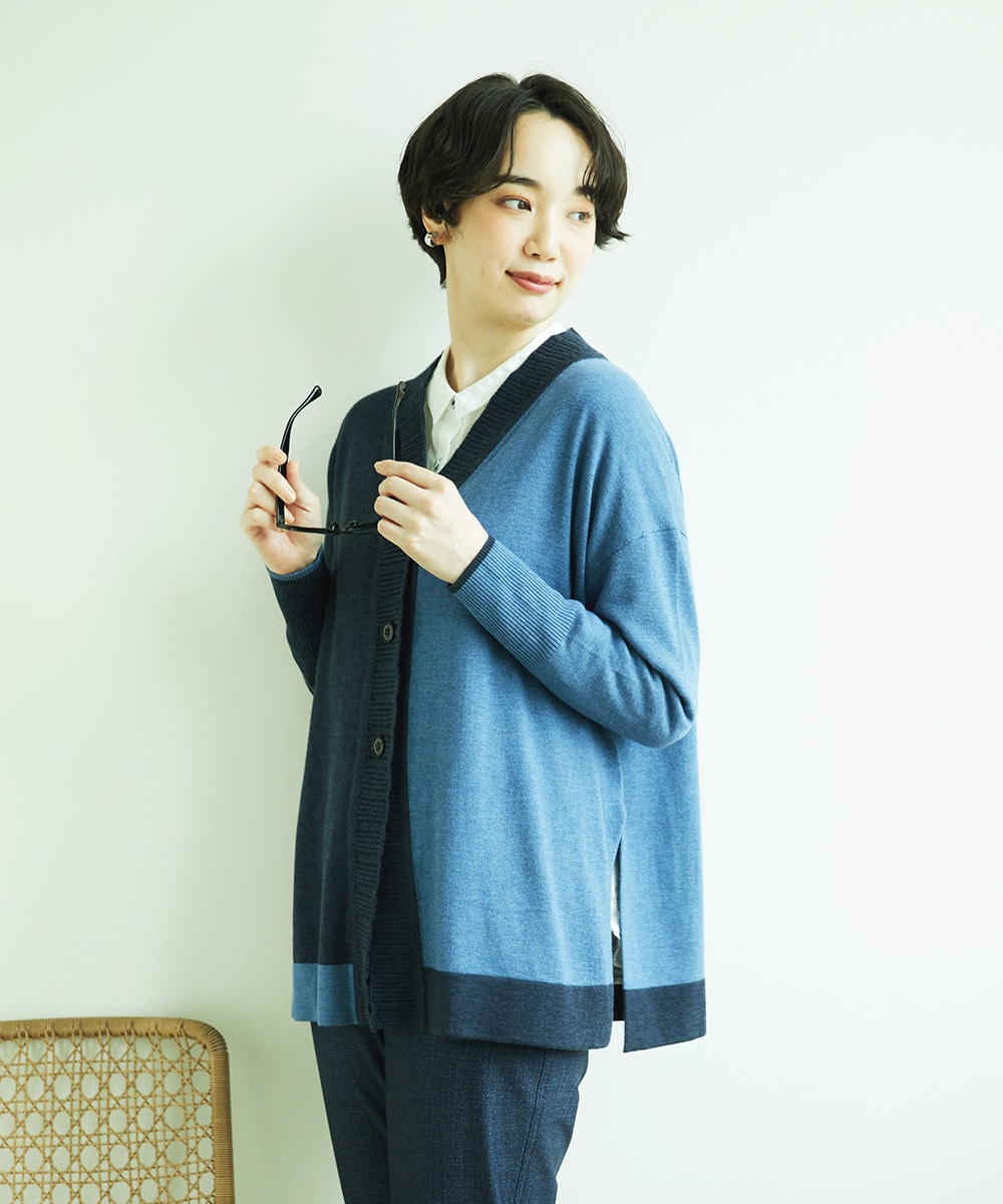 柔らかく滑らかなビスコースレーヨンとウールの混紡糸を使用したニットカーディガン。ラフに羽織っていただけるサイズ感で、デイリー使いにもおすすめ。バイカラーが着映えし、楽ちんながらもしっかりお洒落な印象に。