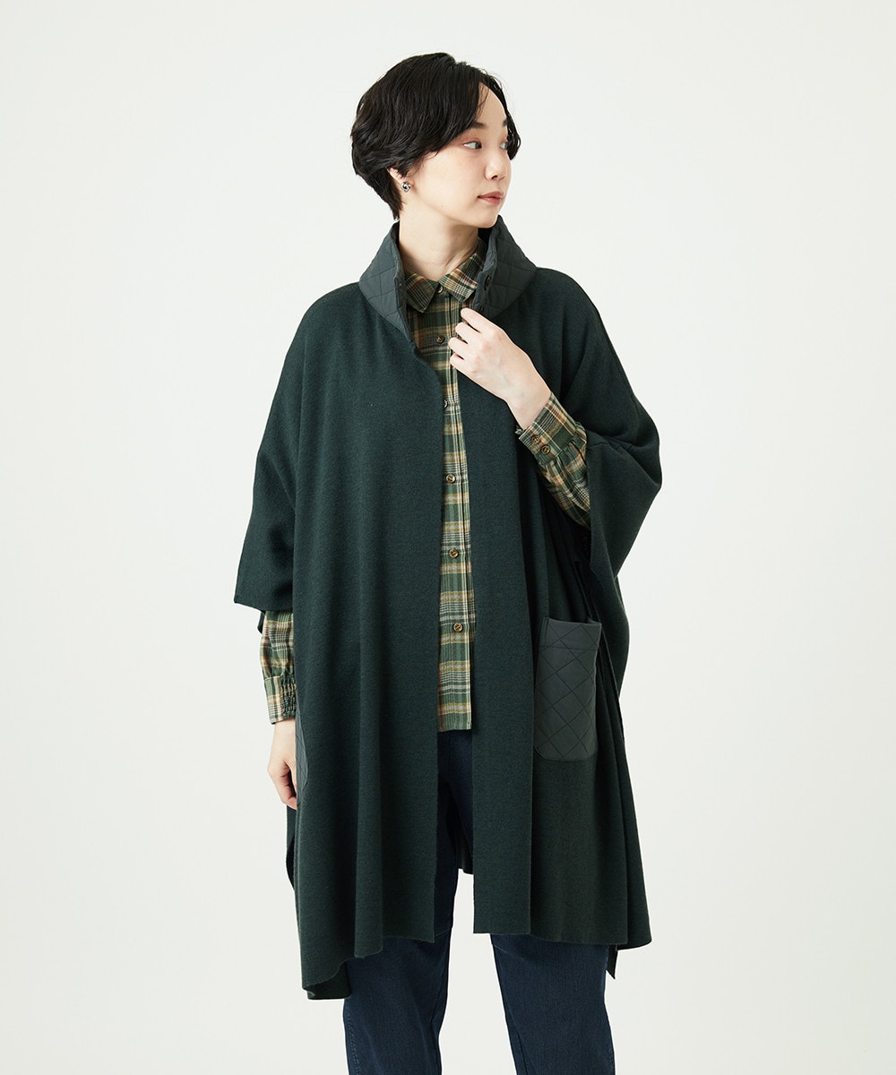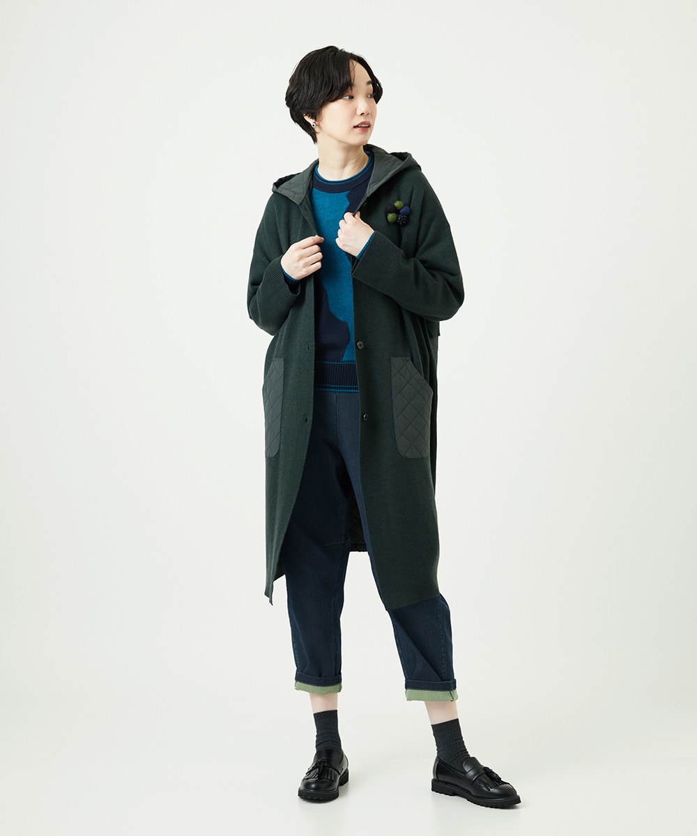 ニットの柔らかさとキルティング生地のコンビネーションが特徴的なフード付きアウター。シックなカラーでデイリーに使いやすく、シーン問わず活躍する便利なアイテム。ブローチでワンポイント、アクセントを加えるのもおすすめ。