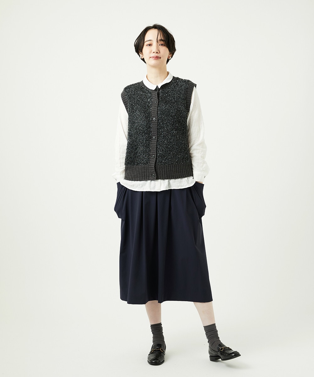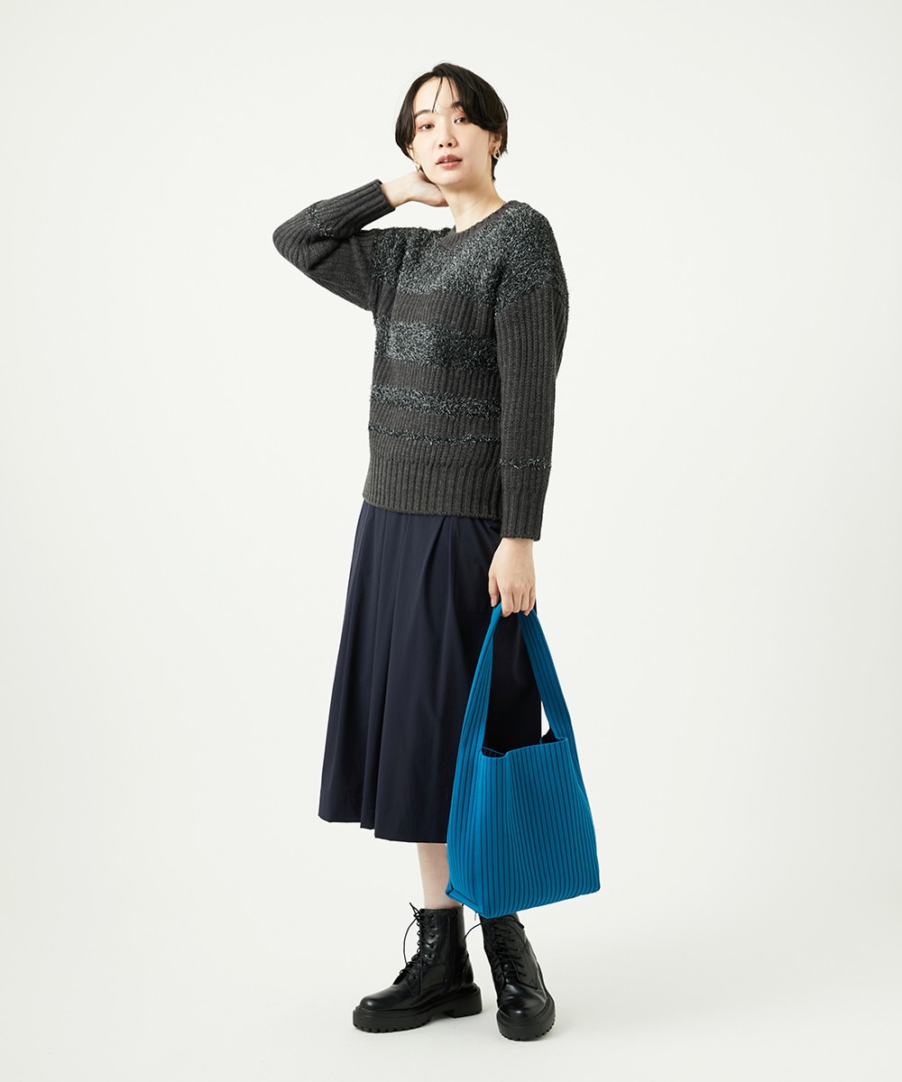 シックなカラーリングにさりげないラメ感がきれいなニット。1枚着ではもちろん、アウターも選ばずに重ねることができるので、秋冬の間、日常へ取り入れやすいアイテム。ふわっとしたスカートを合わせても甘くなりすぎず、大人のカジュアルコーデが完成。
