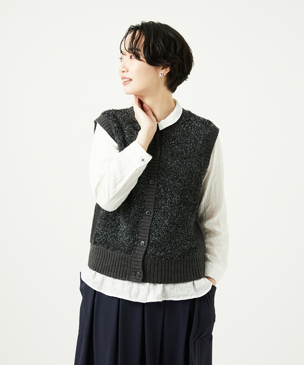 ラメの入ったフェザーヤーンと無地のリブ生地のコンビネーションが魅力的なデザイン。風合い・手触りの良く、合わせるインナー次第で気温が変化するこれからの時期におしゃれを楽しめるので長く使えるアイテム。ブラウスとスカートを合わせればちょっときれい目にお出かけ着が完成。