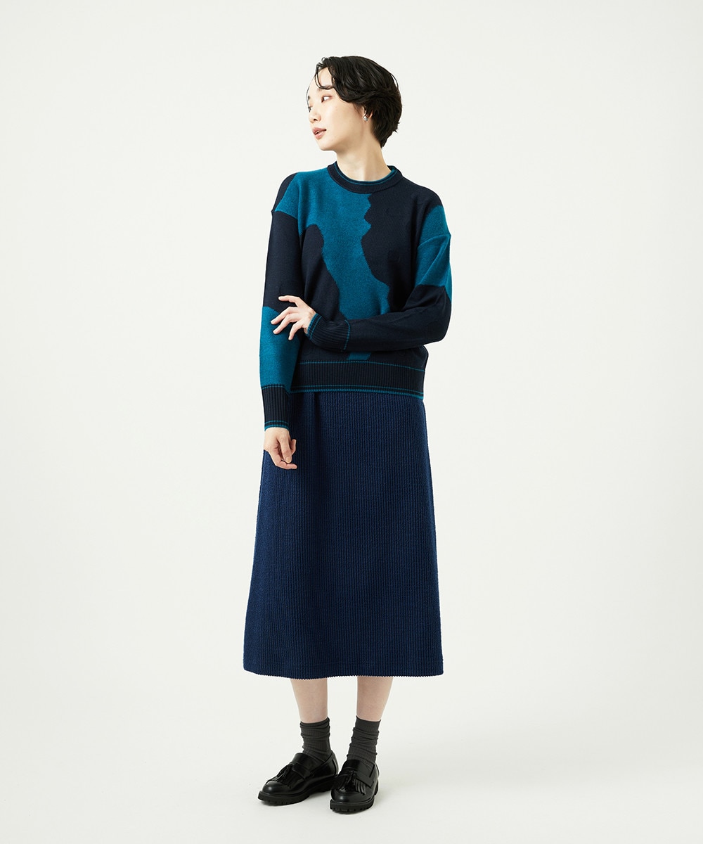 よく見るとイタリア半島になっている柄は、遊び心と高級感を兼ね備えた個性的なデザイン。シンプルなアイテムに手を伸ばしがちなこの時期、ほどよくインパクトのあるニットは、しっかり着映えしおしゃれを引き上げてくれる。1つあると重宝するアイテム。
