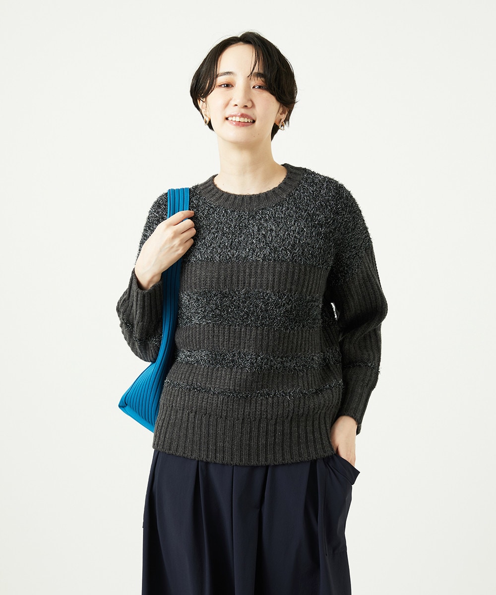 さりげない輝きのあるフェザーヤーンを使用したトレンド感のあるニット。着映え感がありながらも、シンプルなボーダーデザインはカジュアルにもきれいめにも使い勝手抜群。インナーにブラウスをレイヤードしてきちんと感も持たせつつ、ボトムはゆるっとワイドパンツで抜け感を演出。