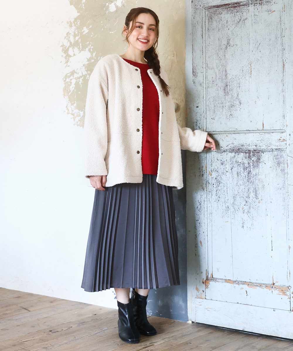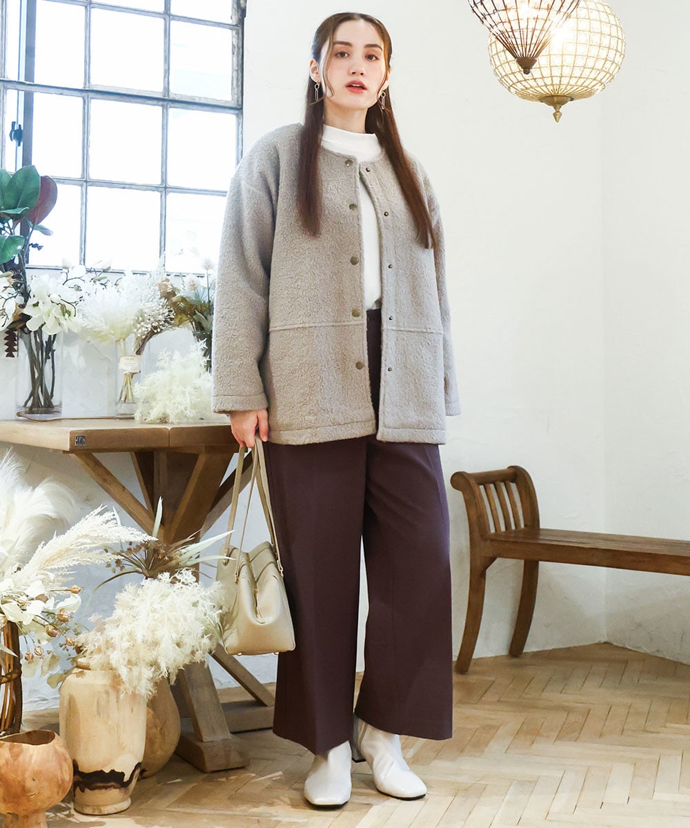 軽さと暖かさが特徴のブークレ素材で、気ぐるしさなく着られるのが嬉しいポイント。