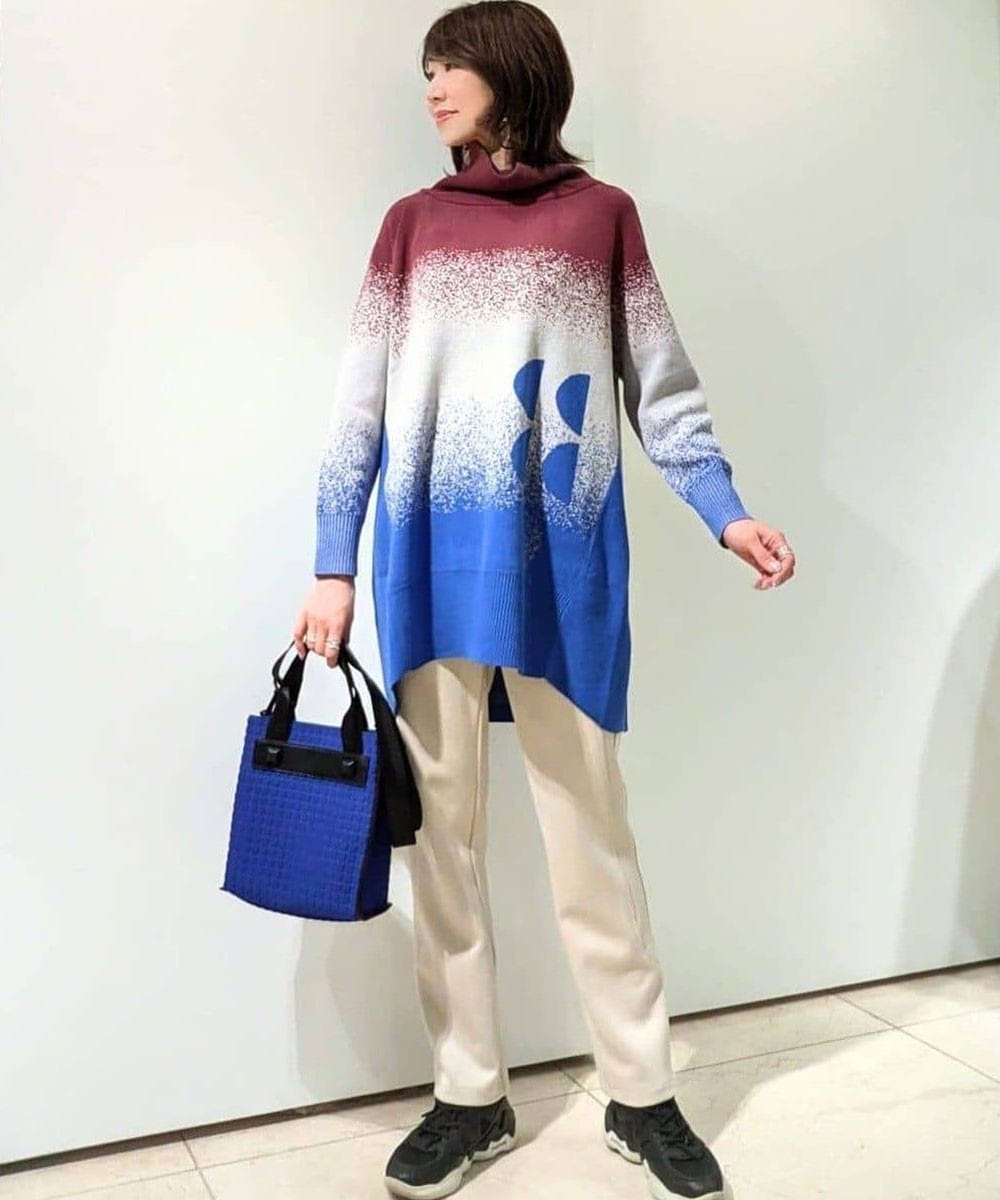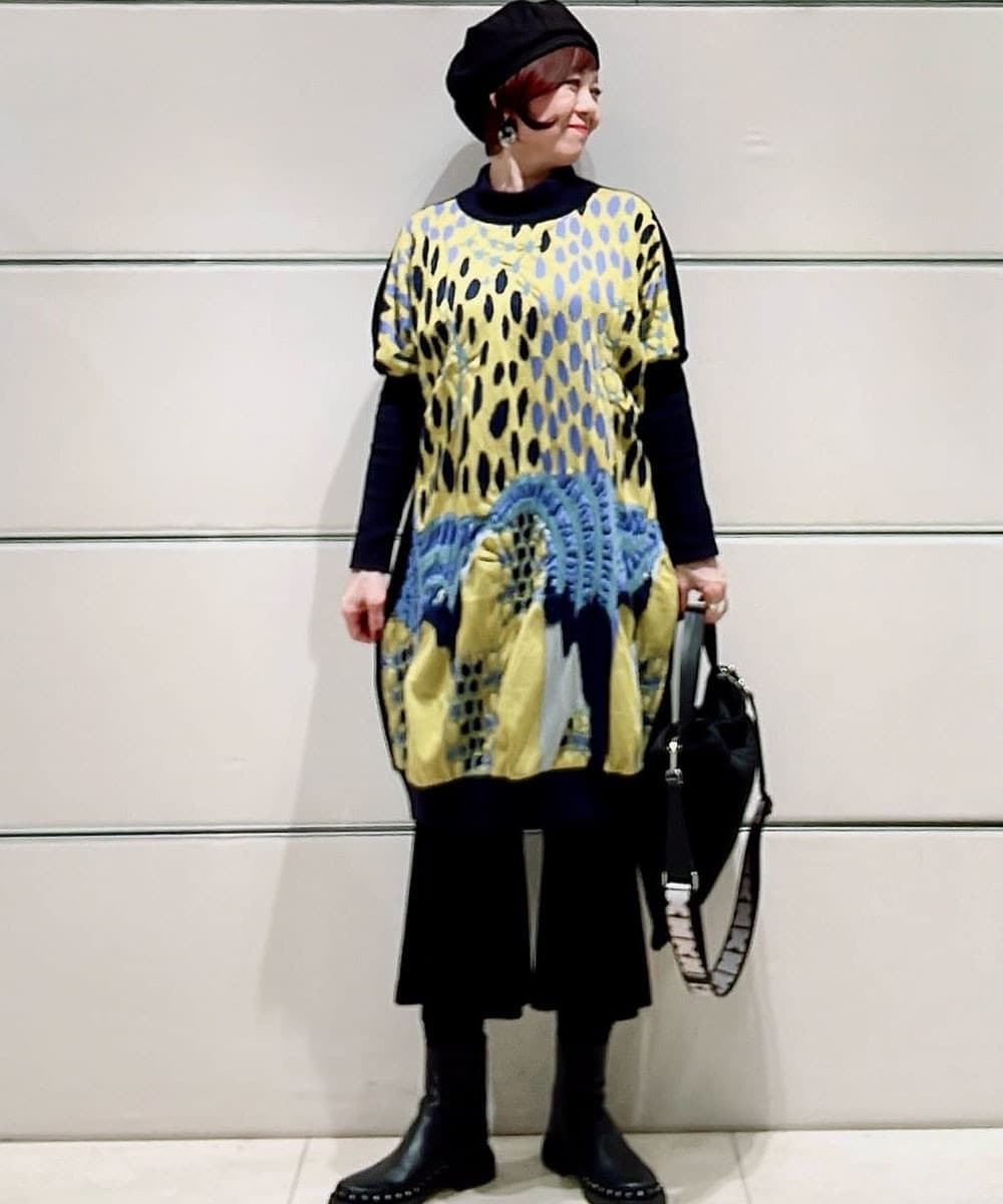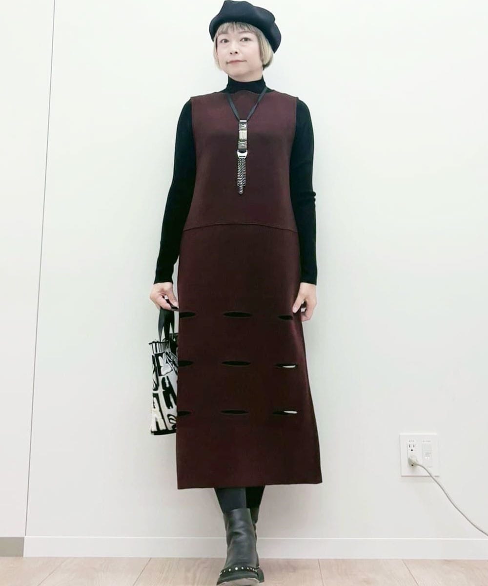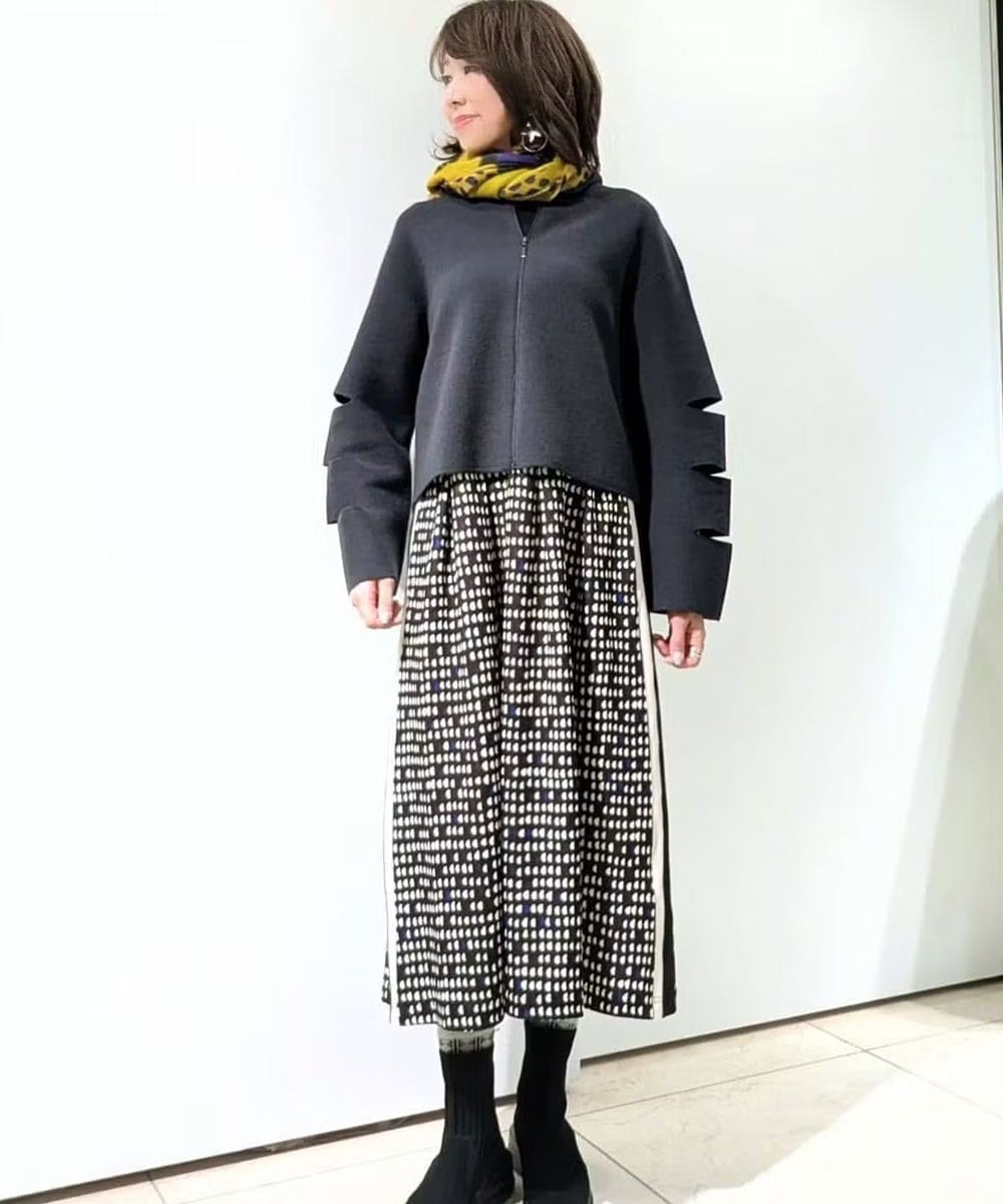 低身長でこちらの丈感になりますので、細身パンツやタイツ+ブーツのスタイリングがおすすめです。