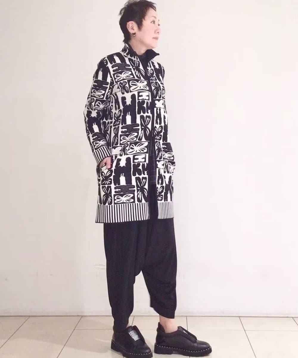モノトーンロゴ柄が程よいモード感を演出するジャガードニットアウター