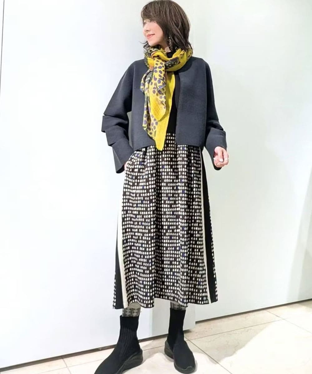 2ピース風カジュアルワンピースに上質なショート丈ジャケットでウォーム感ある大人のデイリーカジュアルスタイルです。