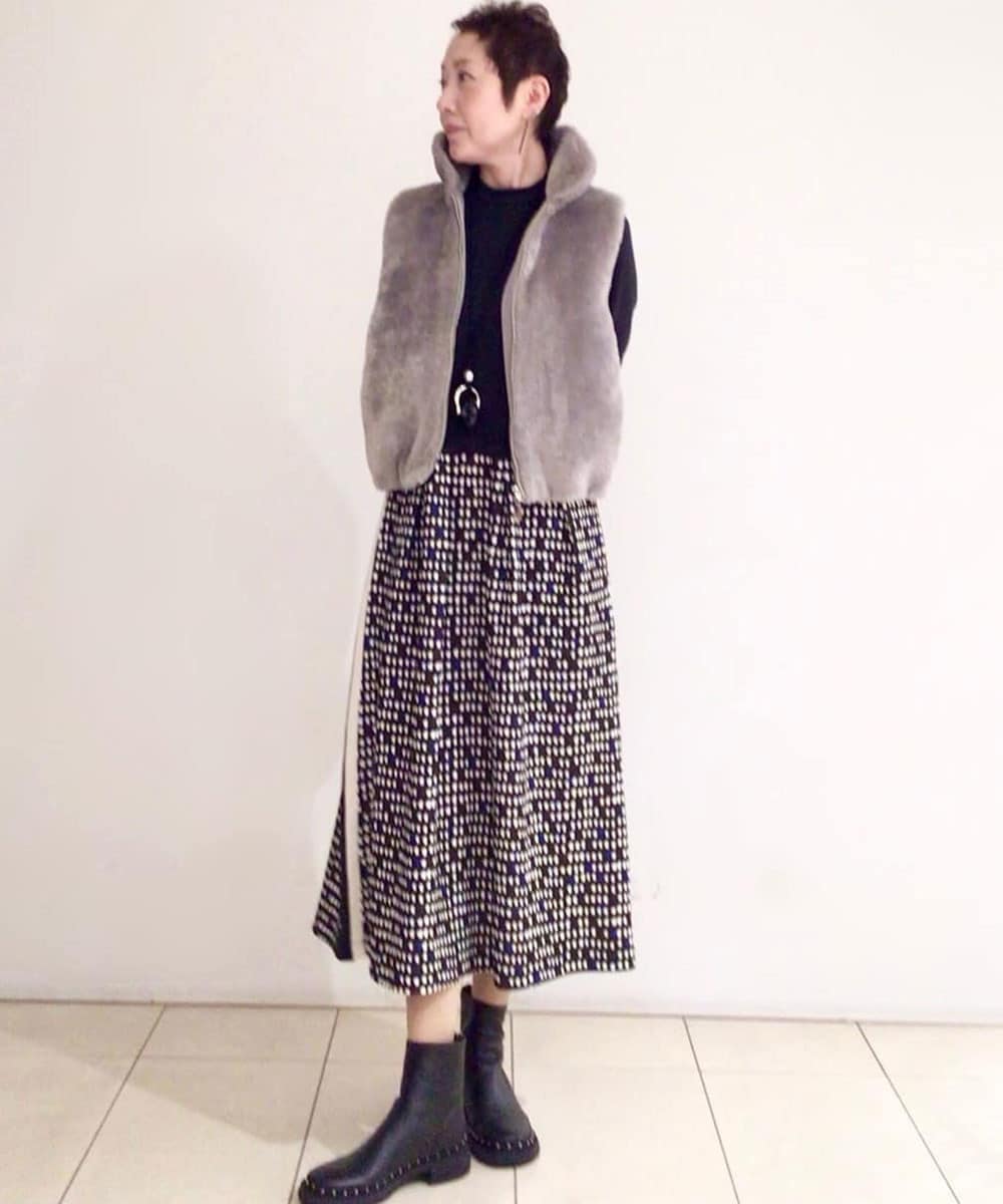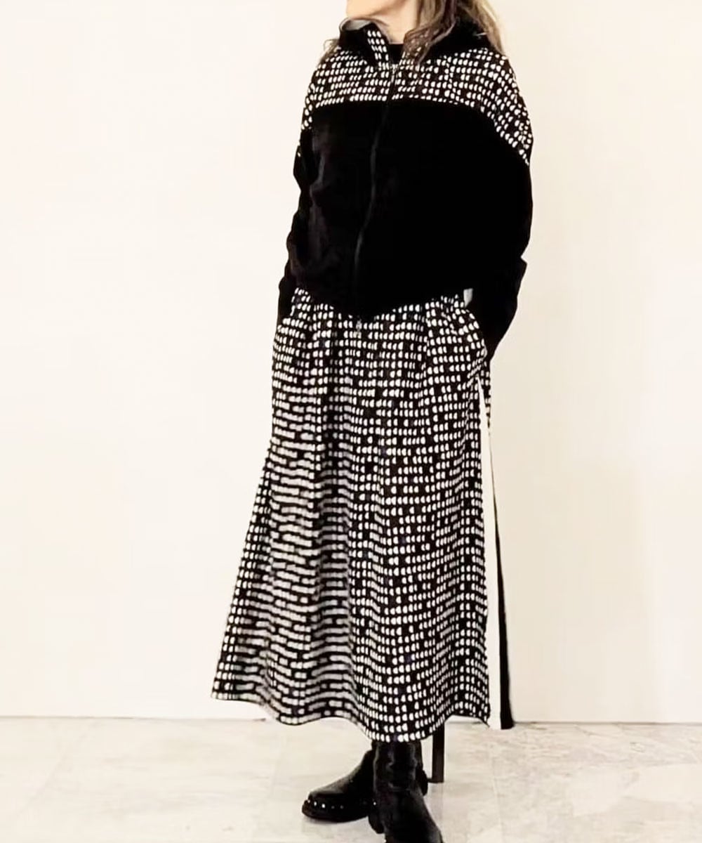 無地トップスと小付きドットのプリントスカート、ツーピースのようなデザインが魅力的な一着です。