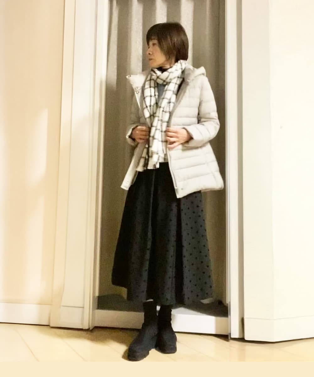白ダウンで明るさと清潔感をプラスしつつ、ライトブルーのカーデで柔らかいニュアンスをプラス。